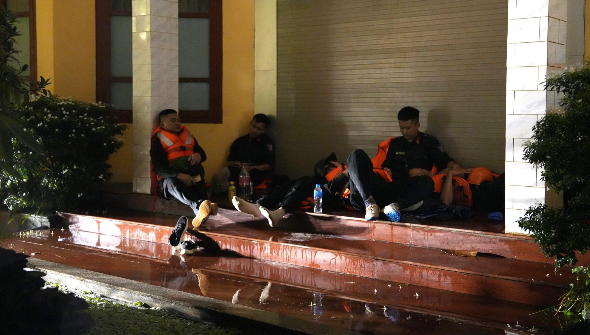 Giây phút nghỉ ngơi hiếm hoi của các cán bộ chiến sĩ sau một đêm thức trắng “chạy đua” với mưa bão giúp người dân vượt lũ. Ảnh: Đỗ Cảnh. |