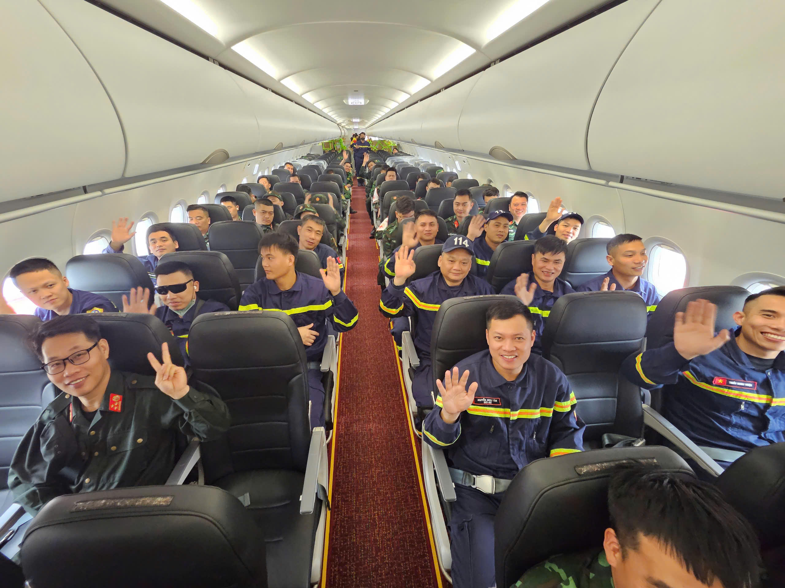 Lực lượng cứu hộ, cứu nạn của Bộ Công an và Bộ Quốc phòng khởi hành trên chuyến bay Vietjet từ Hà Nội đến Yangon, Myanmar. (Ảnh: Tuấn Huy) |
