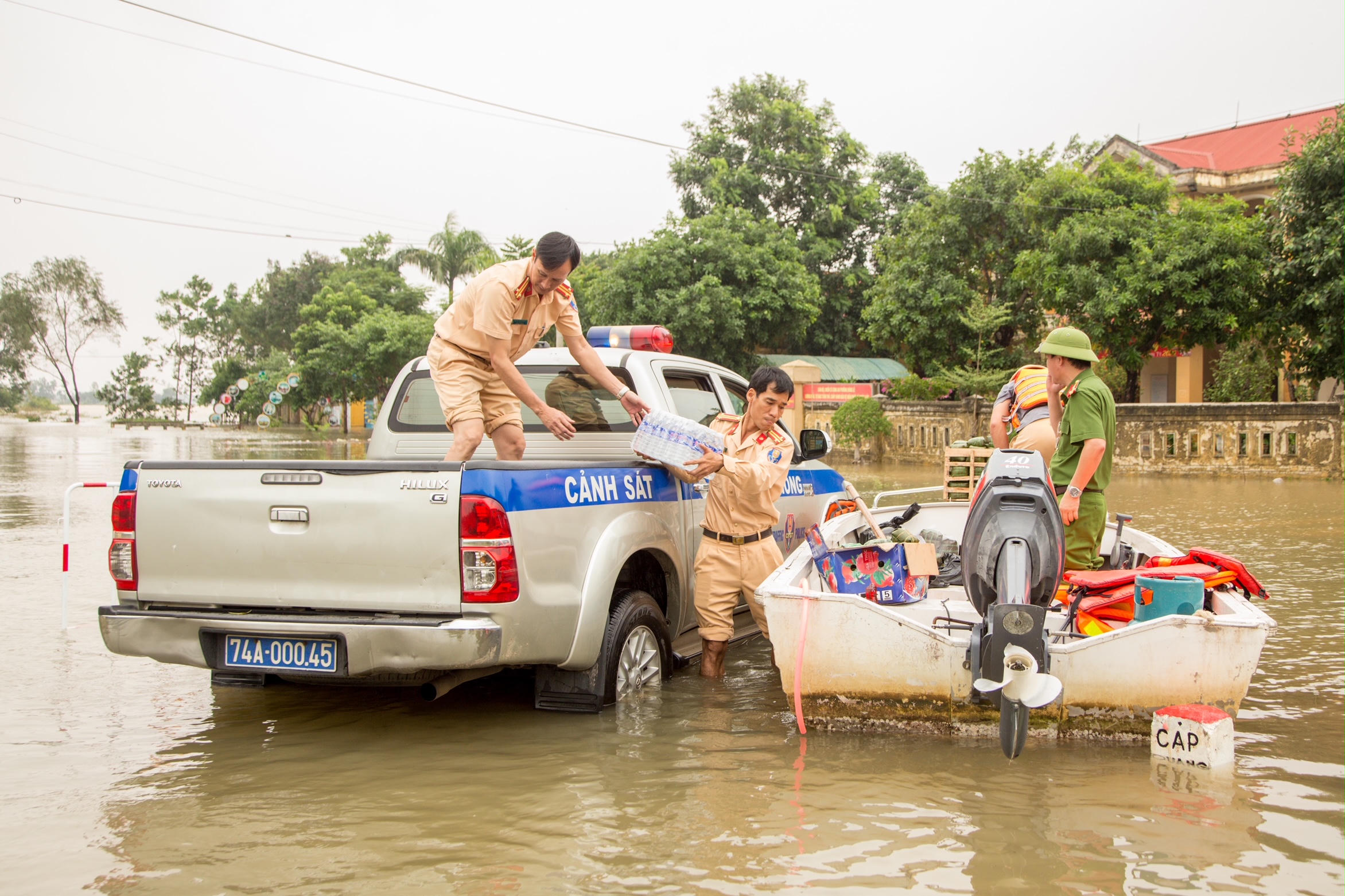 Trong thời điểm người dân trên địa bàn toàn tỉnh đang gặp phải rất nhiều khó khăn, lực lượng Công an trong toàn tỉnh còn vận động, quyên góp các loại nhu yếu phẩm cần thiết, nấu các suất ăn để hỗ trợ cho người dân đang sống trong các vùng ngập lũ. Tại nhiều nơi, do bị dòng nước lũ chia cắt nên lực lượng Công an phải vận chuyển hàng hóa bằng xe ô tô đến địa điểm tập kết, sau đó trung chuyển sang đò và ca nô để trao tận tay cho người dân. Trong những ngày qua, lực lượng Công an trong toàn tỉnh đã kịp thời trao cho hàng ngàn suất ăn, nhu yếu phẩm cho người dân vùng lũ.