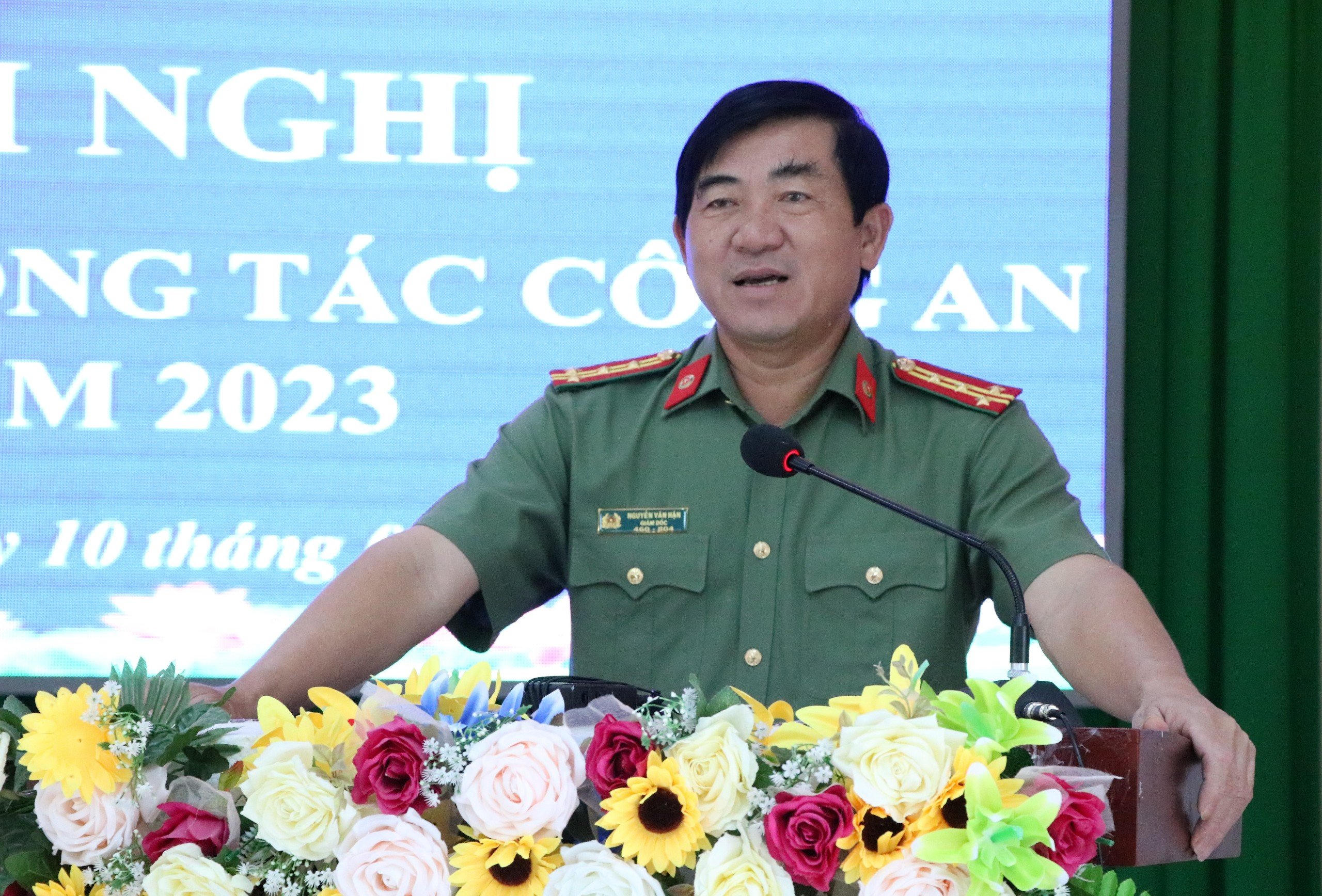 Đại tá Nguyễn Văn Hận - Giám đốc Công an tỉnh phát biểu chỉ đạo tại Hội nghị. |