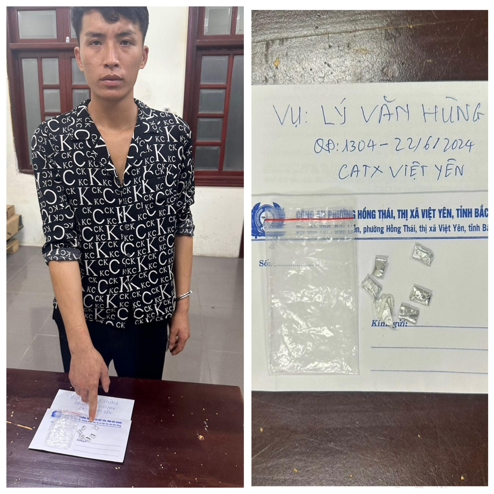 Ngày 20/06/2024, hồi 15h00’ tại đoạn đường gom dân sinh thuộc Tổ dân phố Phúc Long, phường Tăng Tiến, thị xã Việt Yên, Công an thị xã Việt Yên đã bắt quả tang một đối tượng đang có hành vi “Tàng trữ trái phép chất ma túy”. Tang vật thu giữ gồm 32 đoạn ống hút được hàn kín hai đầu bên trong đều chứa chất bột màu trắng(nghi là chất ma tuý heroine). Qua đấu tranh khai thác, đối tượng khai nhận tên là C.V.M, sinh năm 1993, trú tại Bản Tà Cáng, xã Nà Tấu, thành phố Điện Biên Phủ, tỉnh Điện Biên