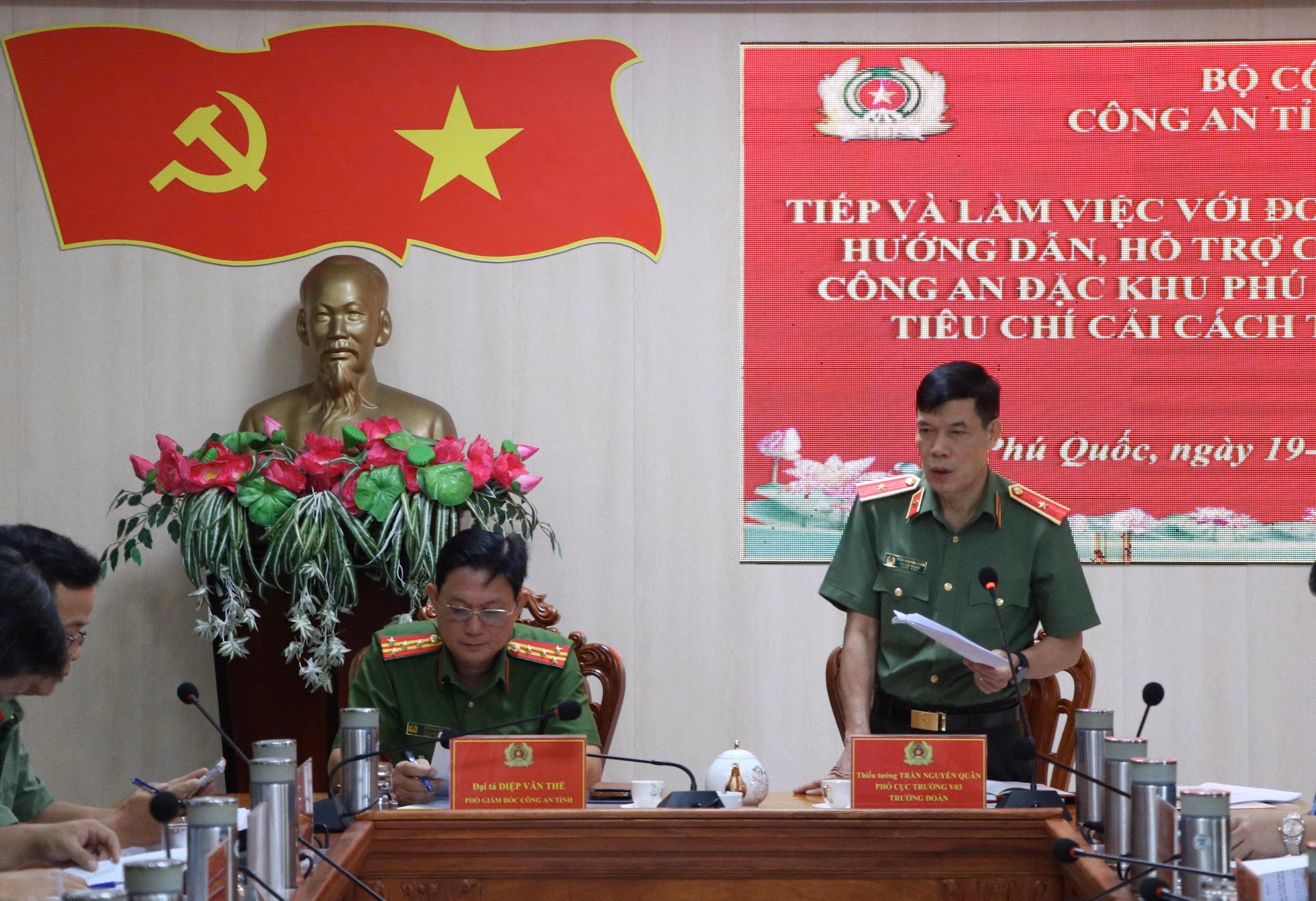 Phát biểu tại buổi làm việc, Thiếu tướng Trần Nguyên Quân ghi nhận, biểu dương những nỗ lực của Công an tỉnh An Giang và Công an đặc khu Phú Quốc trong triển khai cải cách thủ tục hành chính, nhất là tinh thần chủ động, quyết liệt trong việc phục vụ Nhân dân.