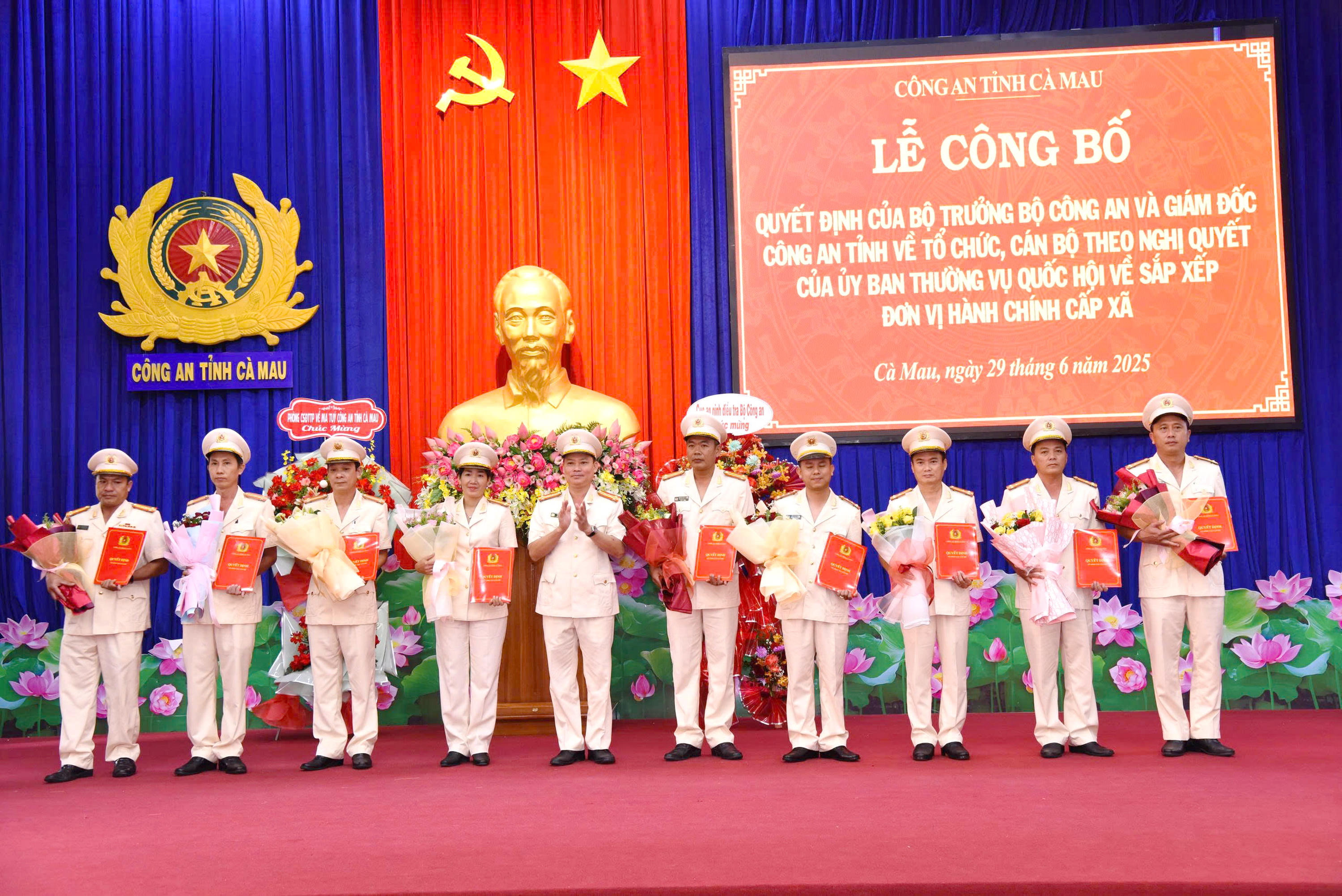 Đồng thời, Công an tỉnh công bố các Quyết định của Bộ trưởng Bộ Công an về điều động, bổ nhiệm 6 đồng chí giữ chức vụ Phó Giám đốc Công an tỉnh Cà Mau (sau sáp nhập); công bố quyết định sắp xếp tổ chức, cán bộ các đơn vị cấp phòng, Công an cấp xã, đồn Công an theo phương án được Bộ Công an phê duyệt. 28 Trưởng phòng và 65 Trưởng Công an xã, phường, đồn Công an đã nhận Quyết định và hoa chúc mừng từ Ban Giám đốc Công an tỉnh.