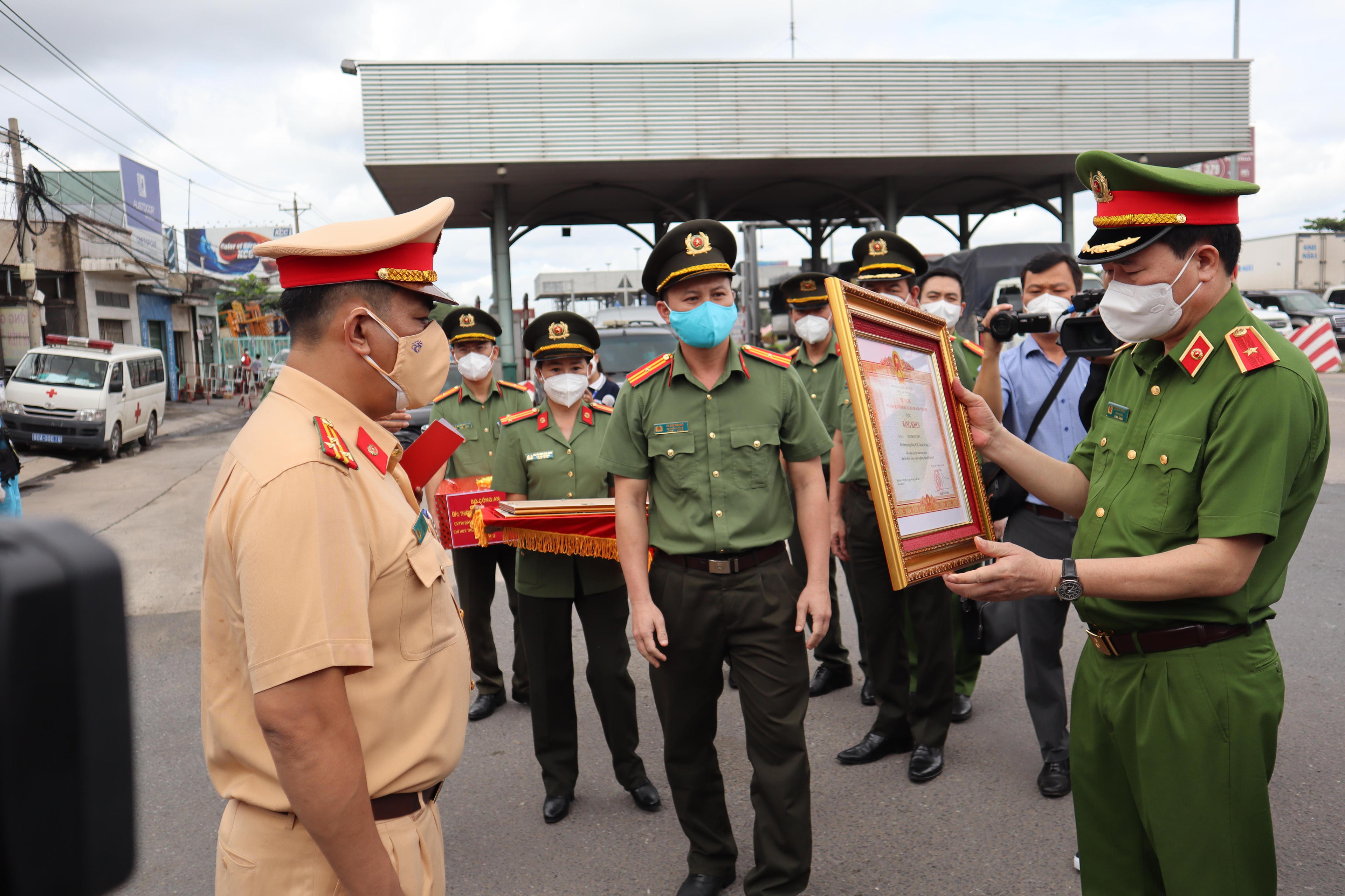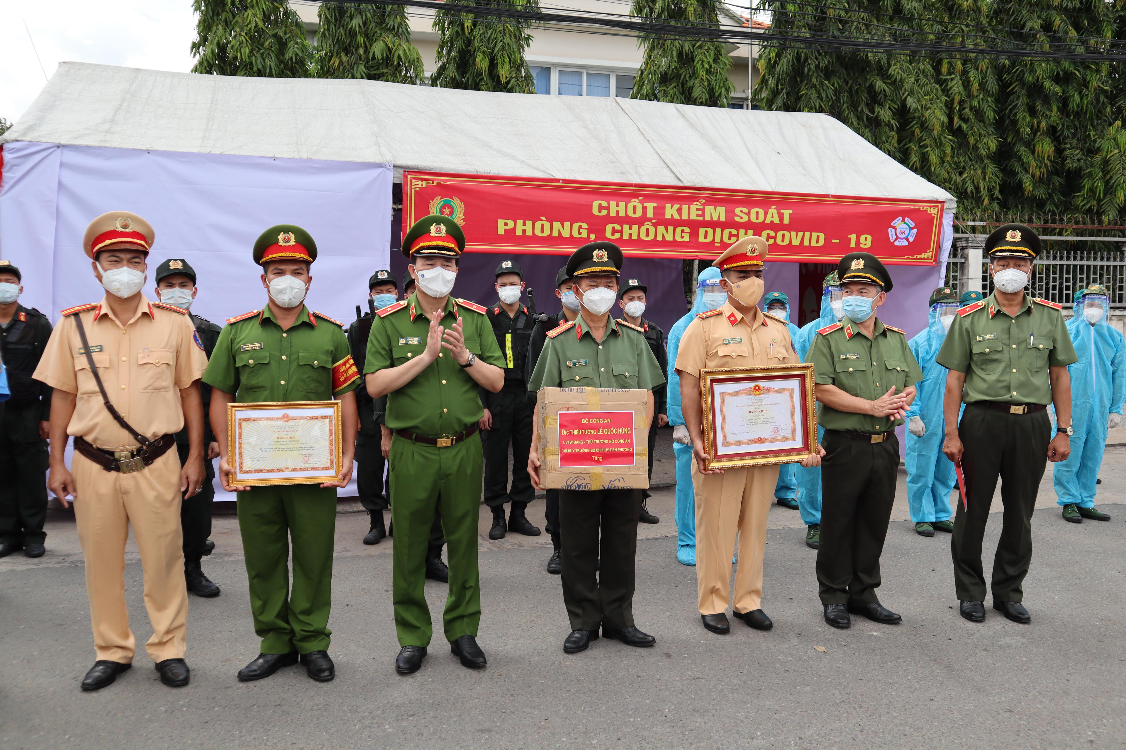 (PLVN) - Tại chốt chống dịch COVID-19 trên tuyến Quốc lộ 1A chân cầu Đồng Nai, Thứ trưởng Bộ Công an - Thiếu tướng Lê Quốc Hùng đã trao bằng khen của Thủ tướng ChÍnh phủ và Bộ trưởng Bộ Công an cho các cá nhân, đơn vị có thành tích xuất sắc trong công tác phòng chống dịch COVID-19 trên địa bàn.