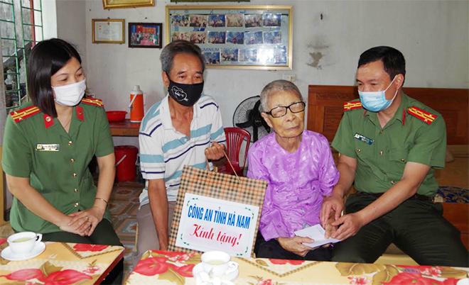 Đại tá Nguyễn Thanh Hà, Phó Giám đốc Công an tỉnh thăm, tặng quà Mẹ Việt Nam anh hùng Nguyễn Thị Mờn tại thị trấn Tân Thanh, huyện Thanh Liêm, Hà Nam. |
