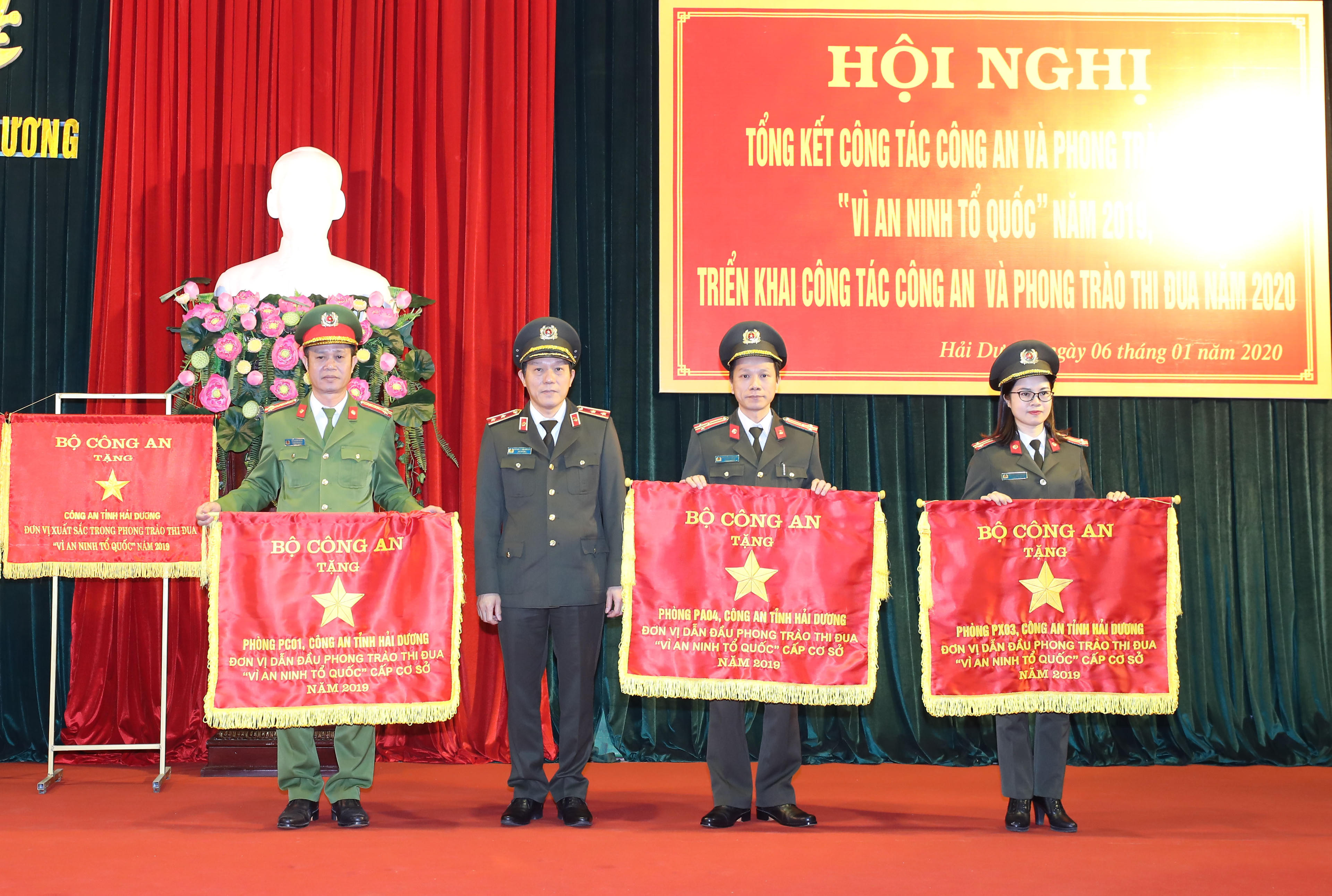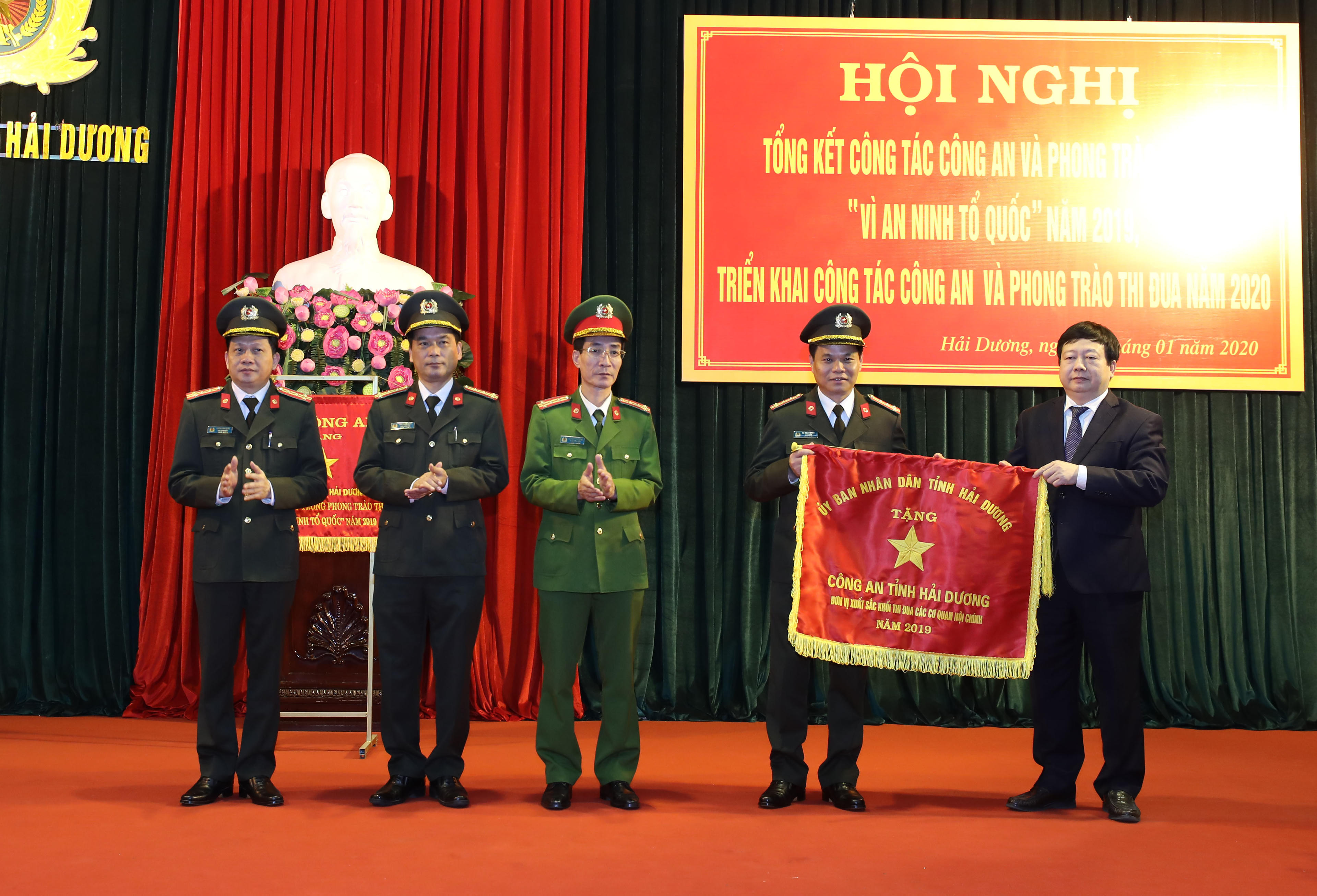 (PLVN) - Ngày 6/1/2020, Công an tỉnh Hải Dương đã tiến hành tổ chức Hội nghị tổng kết công tác Công an và phong trào thi đua “Vì an ninh Tổ quốc” năm 2019, triển khai công tác công tác công an và phong trào thi đua năm 2020. Cũng tại Hội nghị, lực lượng Công an tỉnh Hải Dương đã vinh dự được đón nhận Cờ thi đua của Bộ Công an và của UBND tỉnh Hải Dương vì những thành tích, nhiệm vụ đã đạt được.