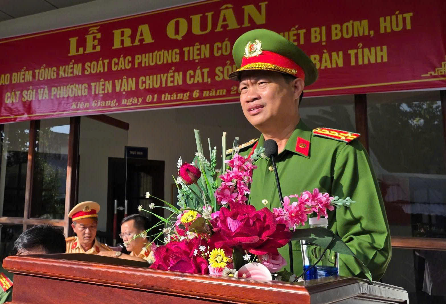 (PLVN) - Sáng 1/6, Công an tỉnh Kiên Giang tổ chức Lễ ra quân cao điểm tổng kiểm soát phương tiện có gắn thiết bị bơm, hút và vận chuyển cát, sỏi trên địa bàn toàn tỉnh. Buổi lễ nhằm triển khai thực hiện chỉ đạo của Bộ Công an và Cục Cảnh sát giao thông về đấu tranh, xử lý các hành vi vi phạm pháp luật trong hoạt động khai thác, vận chuyển, tiêu thụ tài nguyên khoáng sản trái phép.