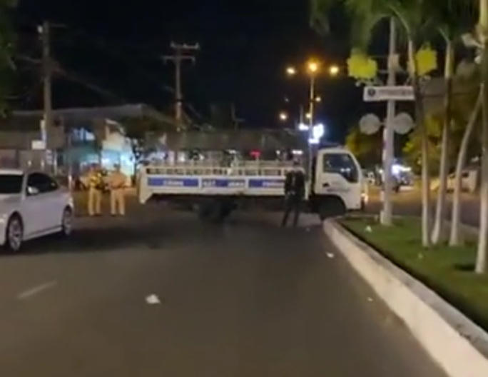 Sau khi nhận được tin báo gây mất trật tự khu phố, lực lượng chức năng đã chặn hai đầu của quán ăn để làm việc (Ảnh cắt từ clip) |