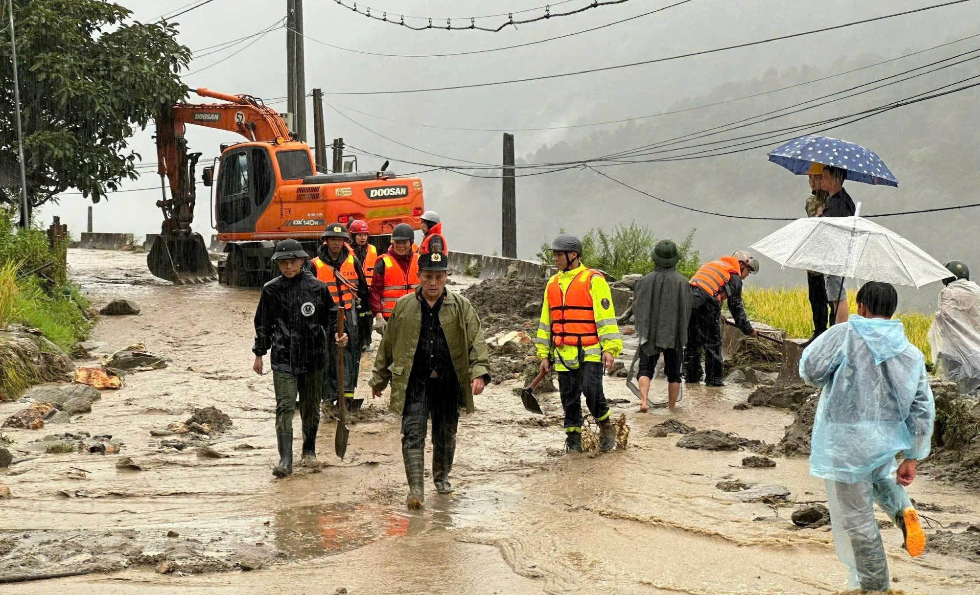 Công an thị xã Sa Pa cùng các lực lượng chức năng thu dọn bùn trên các tuyến đường để đảm bảo giao thông cho người dân