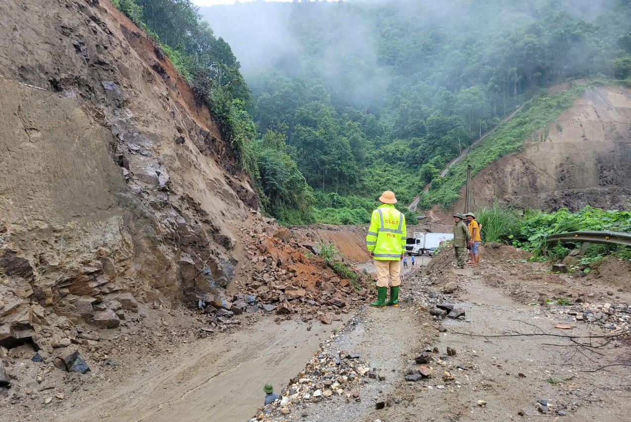 Huy động lực lượng tham gia xử lý điểm sạt lở trên tuyến Quốc lộ 4D đi Sa Pa.
