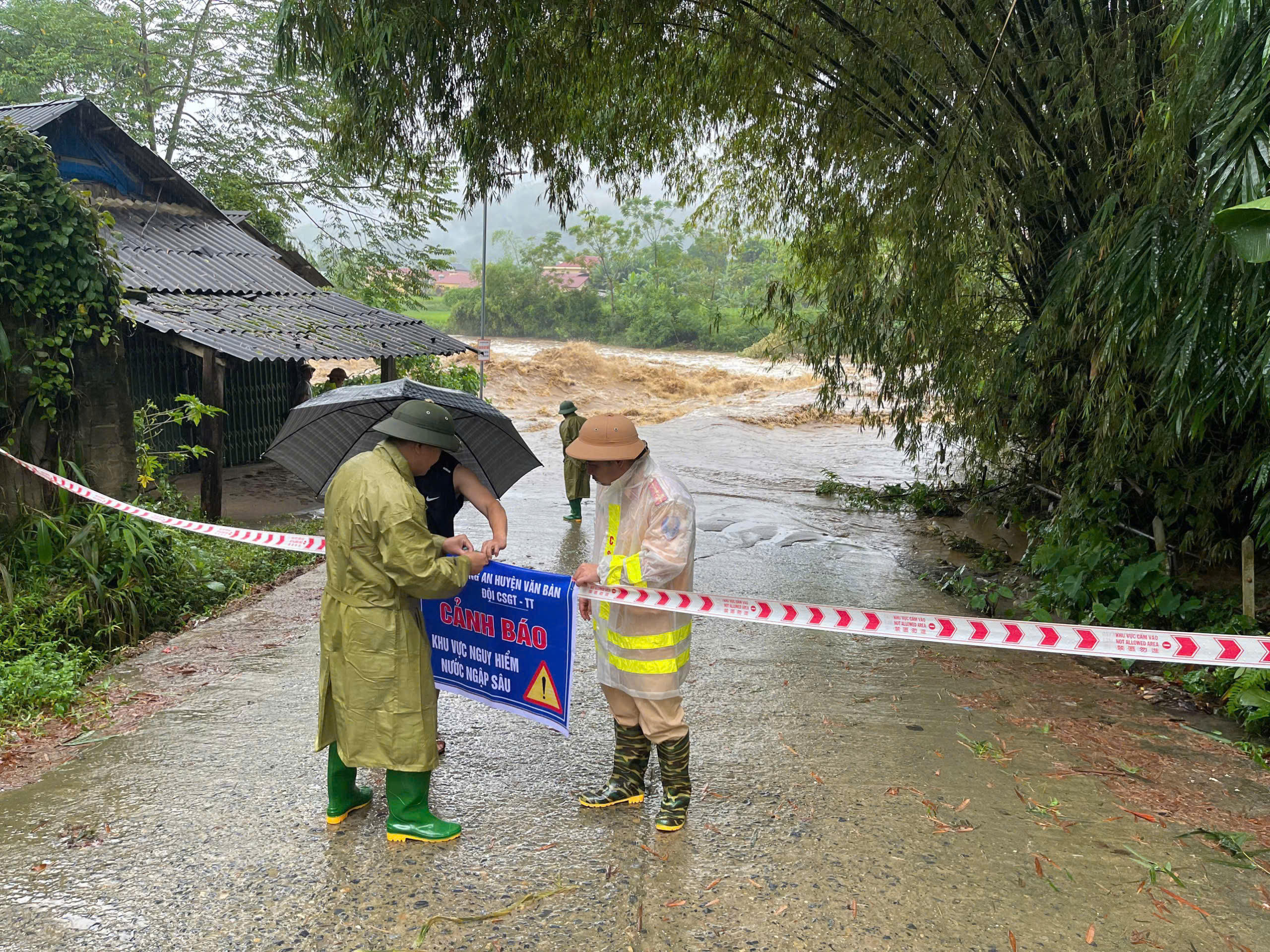 Công an huyện Văn Bàn căng dây cảnh báo không cho người dân qua lại khi nước dâng cao tại khu vực đập tràn tránh nguy hiểm.