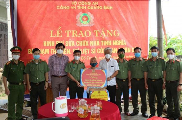 Tại đây, Đại tá Nguyễn Tiến Nam - Giám đốc Công an tỉnh Quảng Bình cũng đã trao tặng số tiền 50 triệu đồng để hỗ trợ gia đình bà Phạm Thị Hiên sửa chữa lại căn nhà tình nghĩa được Bộ Công an cấp kinh phí xây dựng từ năm 2007, qua thời gian sử dụng đã bị hư hỏng, xuống cấp.