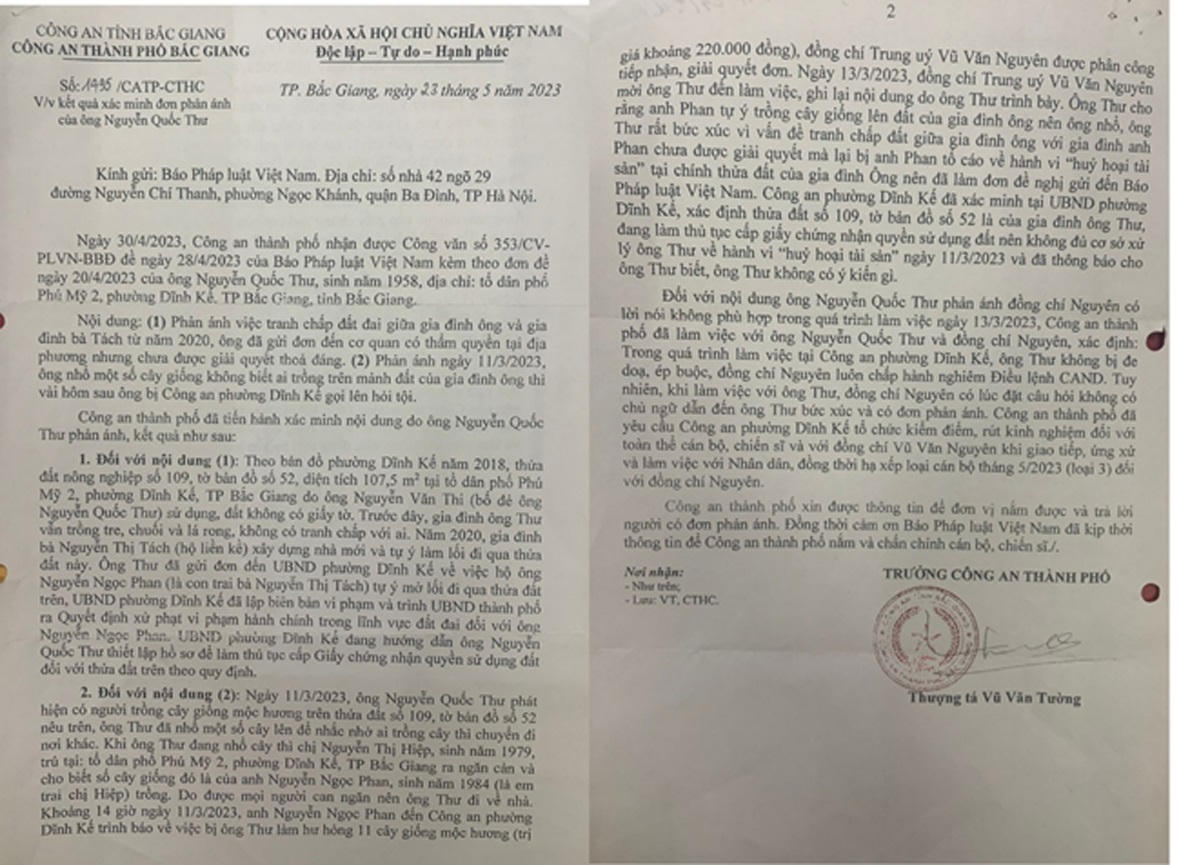 Công văn do Thượng tá Vũ Văn Tường, Trưởng Công an TP Bắc Giang ký cho biết: Đối với nội dung ông Thư phản ánh về việc tranh chấp đất đai giữa gia đình ông và một gia đình khác từ năm 2020, ông đã nhiều lần gửi đơn đến cơ quan có thẩm quyền tại địa phương nhưng chưa được giải quyết thoả đáng, Công an TP đã tiến hành xác minh. Theo đó, tại bản đồ phường Dĩnh Kế năm 2018, thửa đất nông nghiệp số 109, tờ bản đồ số 52, tại tổ dân phố Phú Mỹ 2, phường Dĩnh Kế do ông Nguyễn Văn Thi (bố đẻ ông Thư) sử dụng, đất không có giấy tờ. Trước đây, gia đình ông Thư trồng tre, chuối và lá rong, không tranh chấp với ai.
