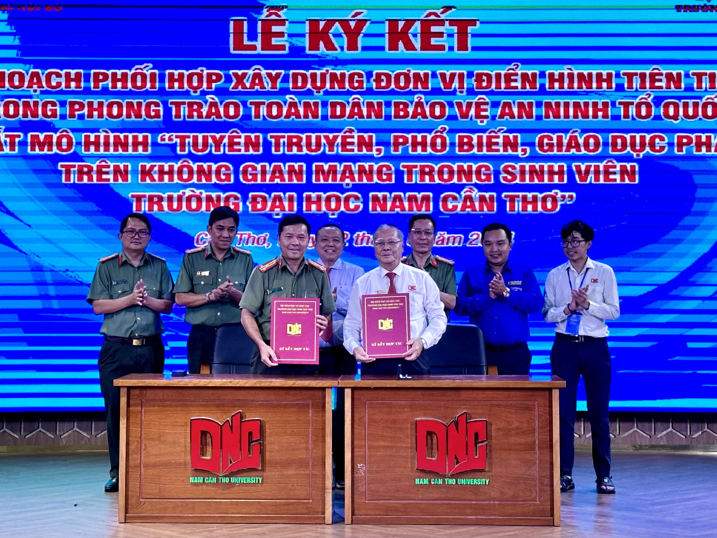 (PLVN) - Ngày 22/5, Phòng An ninh chính trị nội bộ (Phòng ANCTNB) Công an TP Cần Thơ phối hợp với trường Đại học Nam Cần Thơ tổ chức Lễ ký kết kế hoạch phối hợp xây dựng đơn vị điển hình tiên tiến trong phong trào toàn dân bảo vệ an ninh Tổ quốc. Đồng thời, ra mắt mô hình “Tuyên truyền, phổ biến, giáo dục pháp luật trên không gian mạng trong sinh viên Trường Đại học Nam Cần Thơ”.