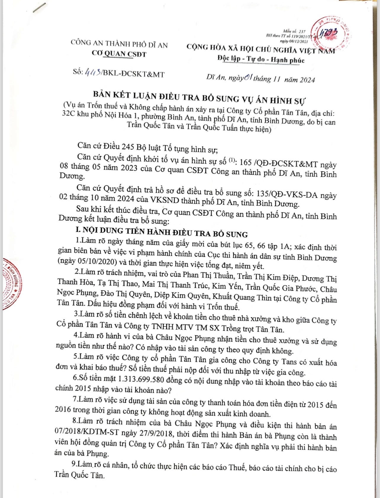 (PLVN) - Sau 1 tháng được TAND TP Dĩ An (Bình Dương) trả hồ sơ yêu cầu điều tra bổ sung, Cơ quan CSĐT Công an TP Dĩ An vừa có kết luận điều tra bổ sung 443/BKL-ĐCSKT&MT (KLĐT) về vụ án xảy ra tại Cty CP Tân Tân.