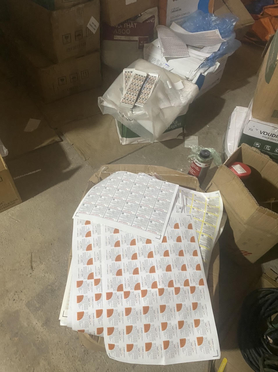Tem nhãn mác, sổ sách, tài liệu liên quan đến việc mua bán hàng giả. Ảnh: Công an cung cấp |