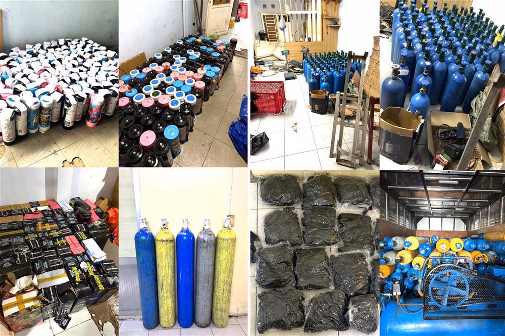 Qua kiểm tra, lực lượng chức năng phát hiện tại 02 địa điểm đang tổ chức hoạt động buôn bán khí N2O (“bóng cười”) trái phép, thu giữ hàng trăm bình khí các loại, bóng cao su, dụng cụ sang chiết chuyên dụng, cùng nhiều tang vật liên quan đến việc phục vụ khí N2O cho khách hàng sử dụng tại chỗ và phân phối ra bên ngoài.