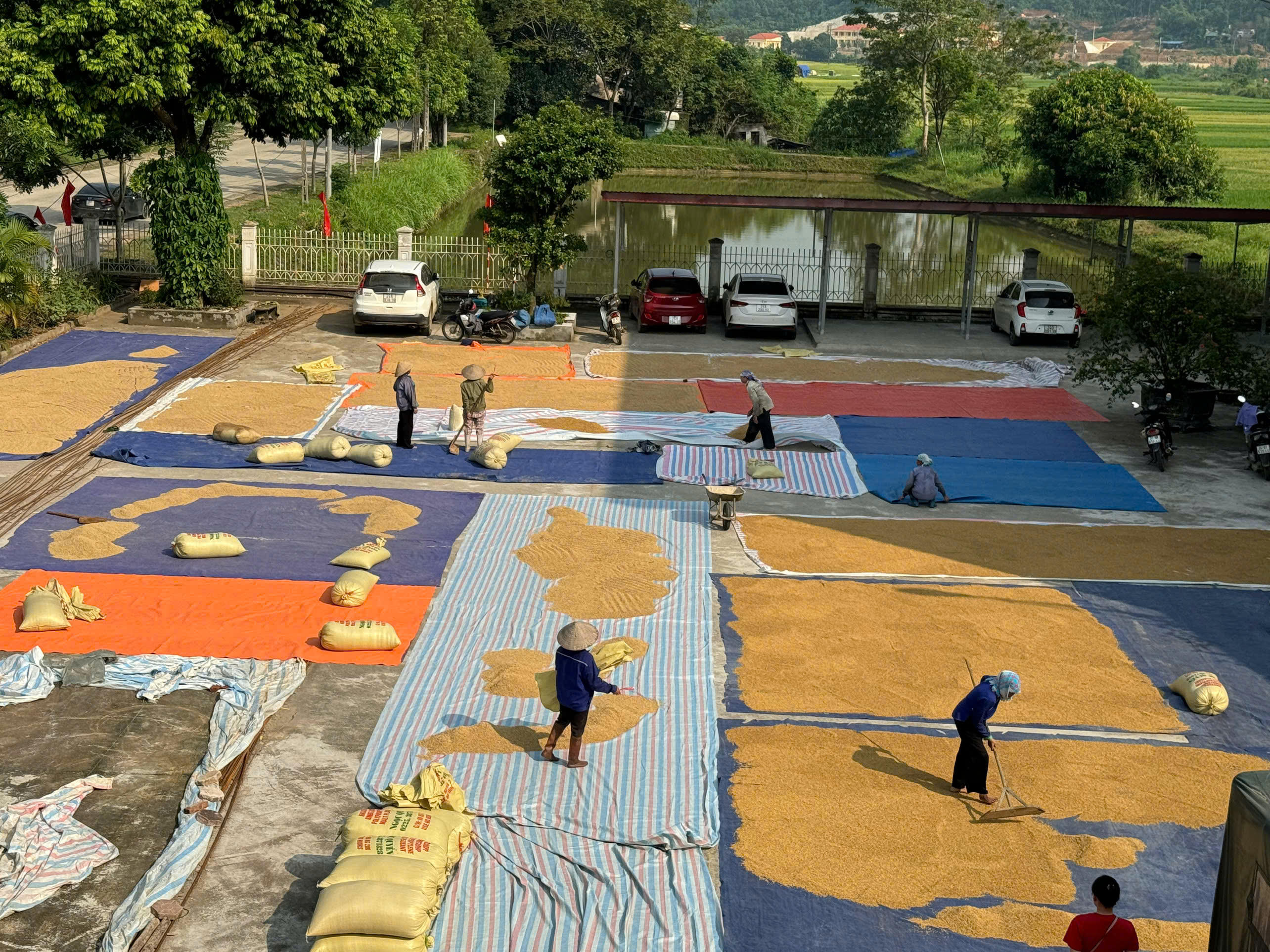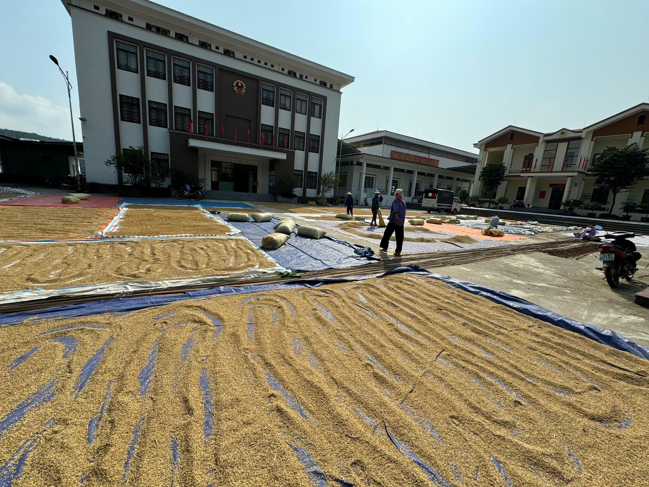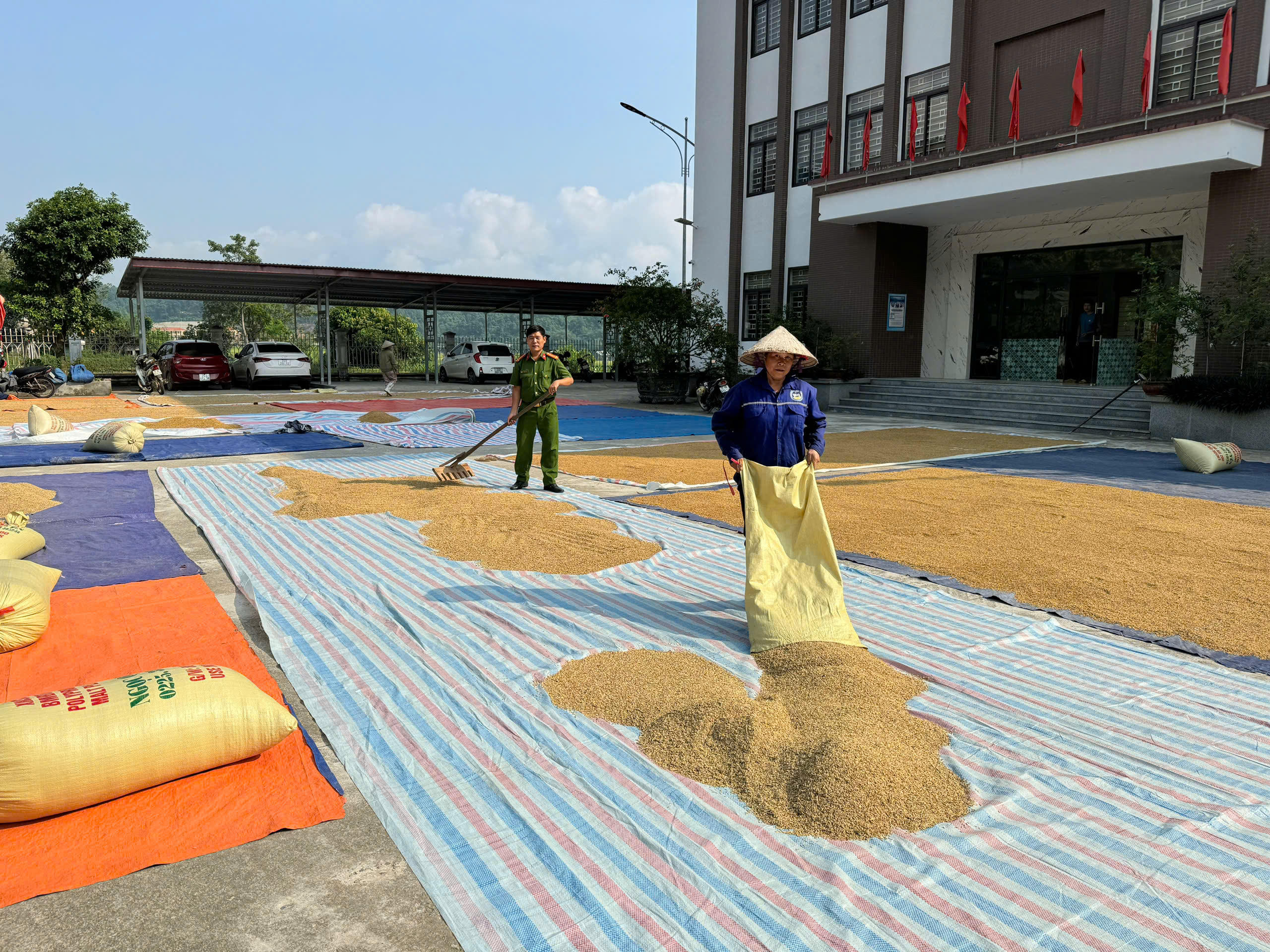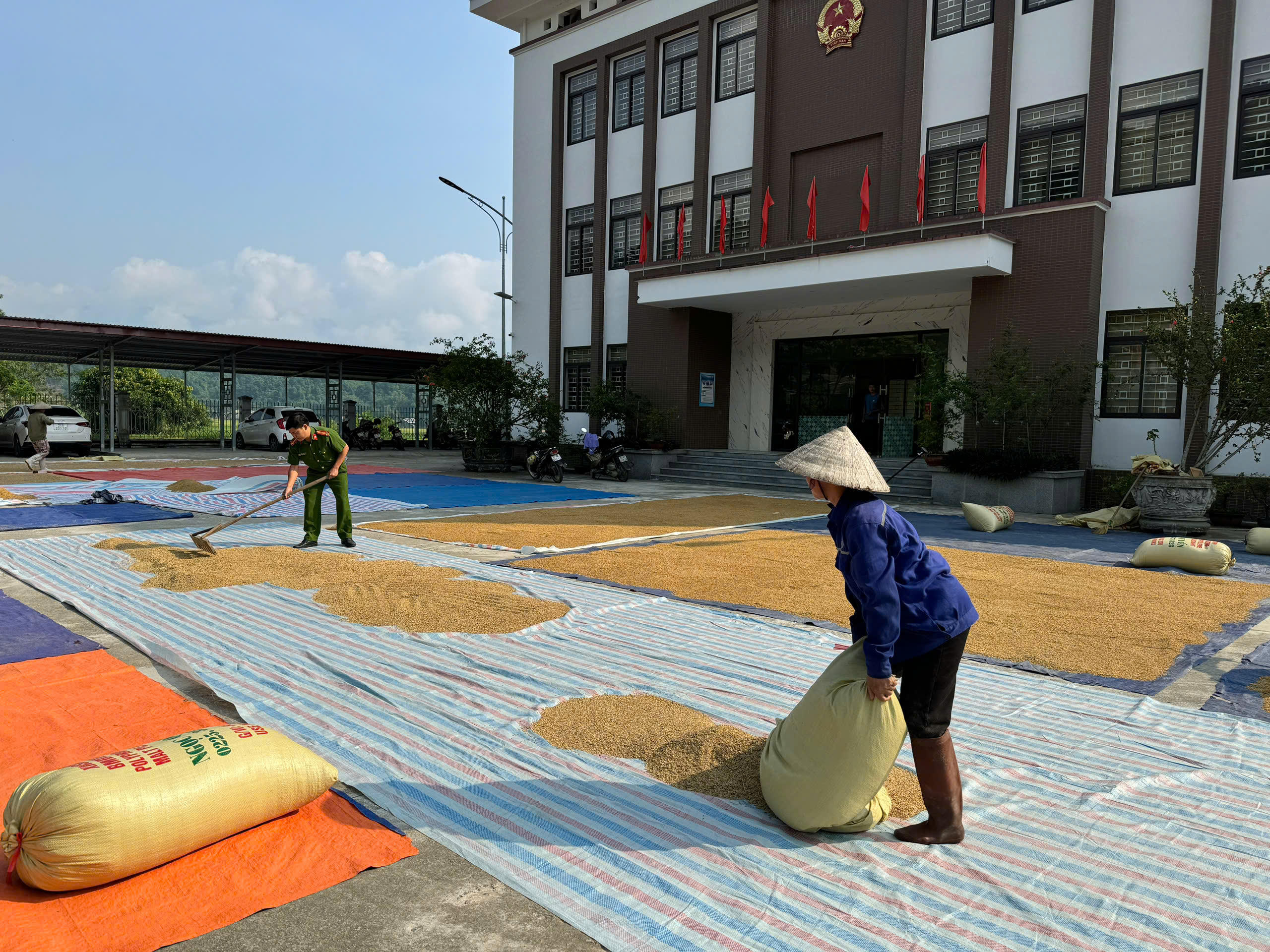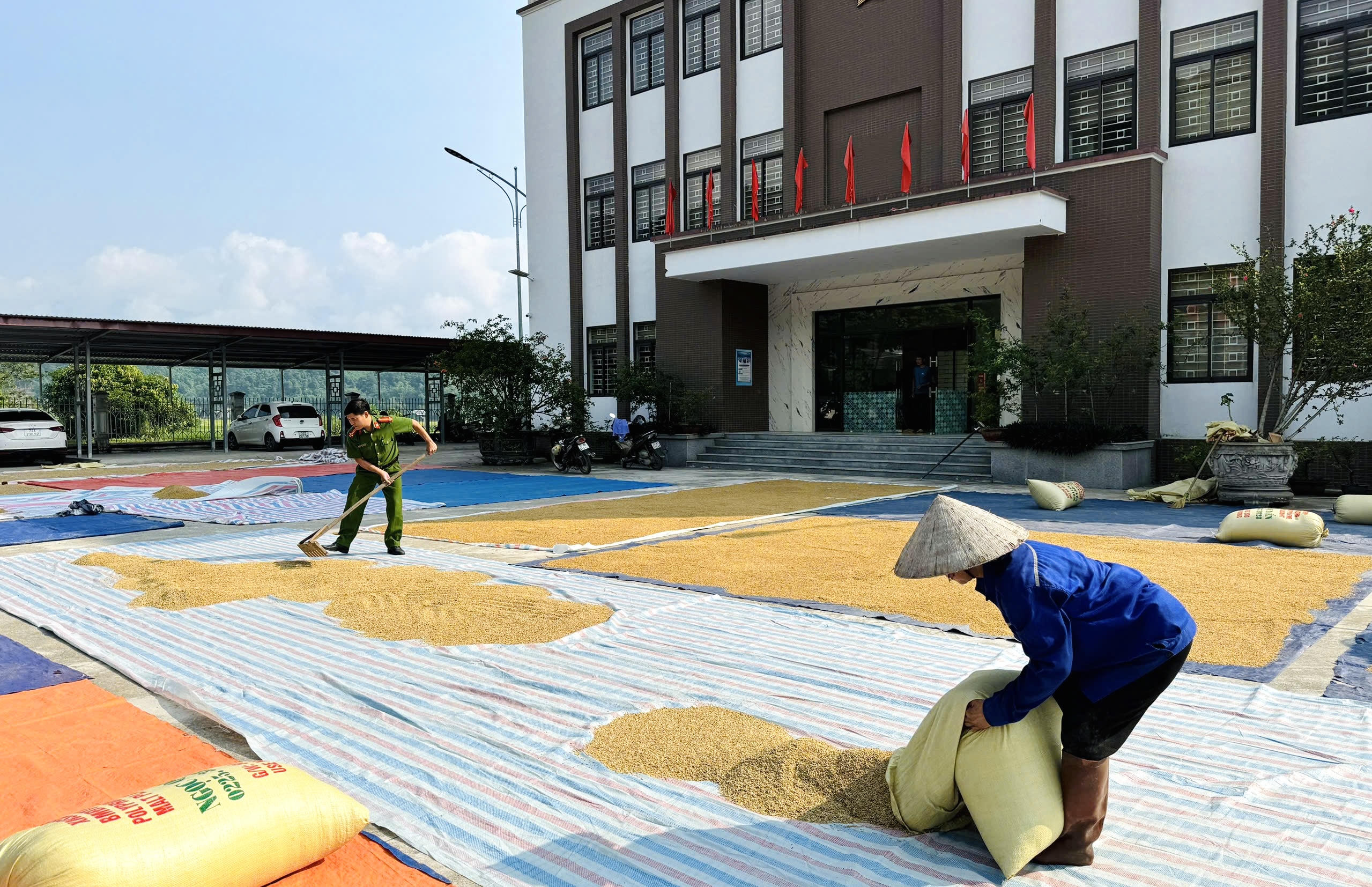 Toàn bộ sân của trụ sở công an xã được sử dụng tối đa cho việc phơi lúa.