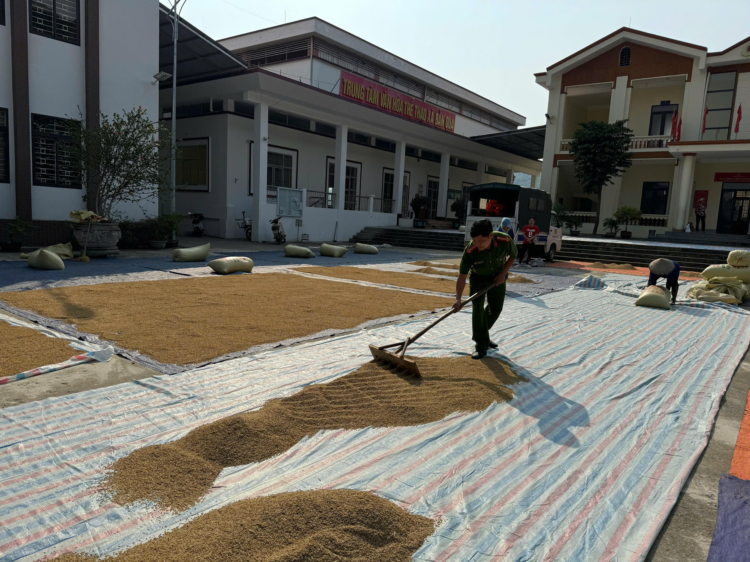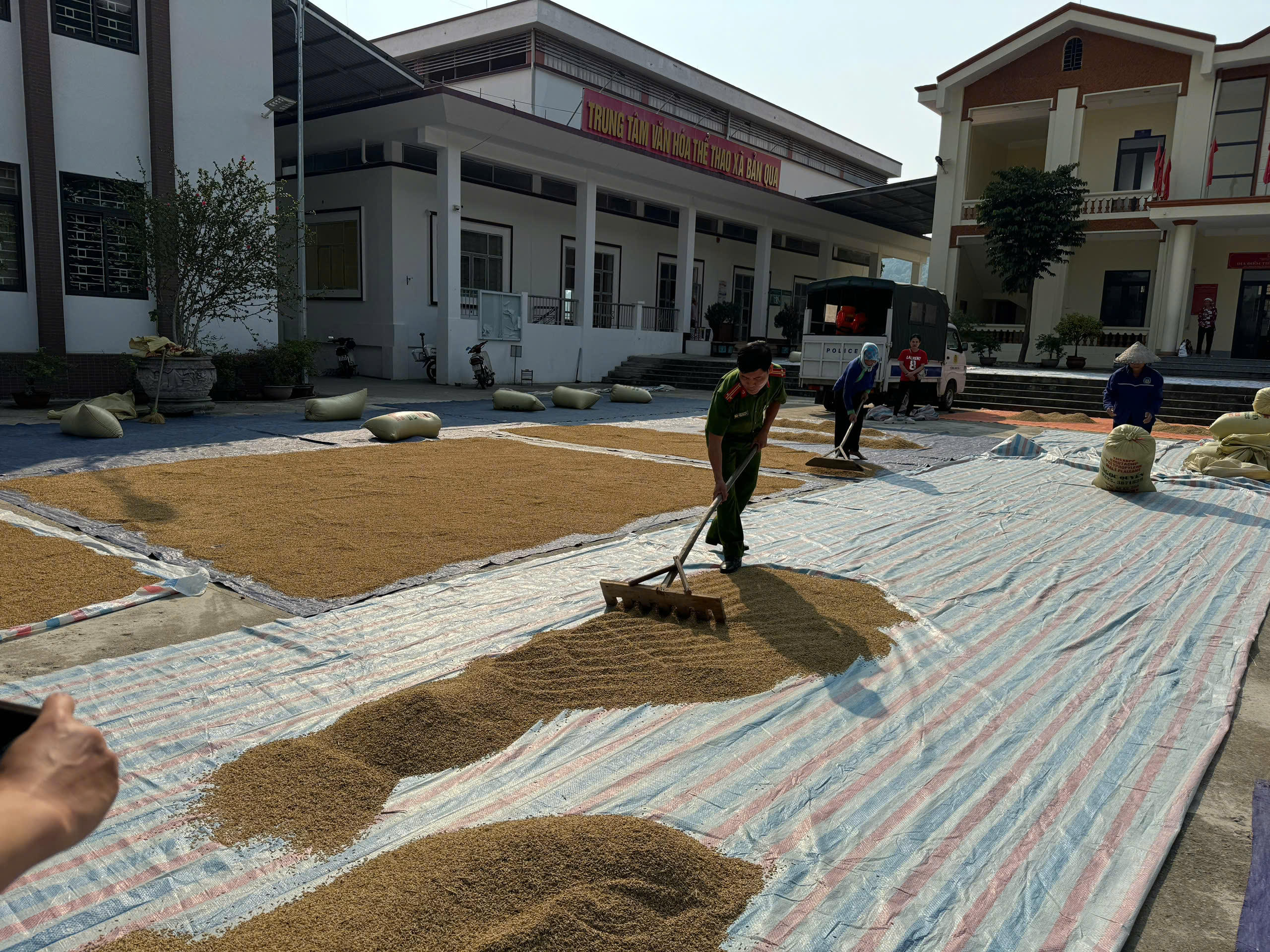 (PLVN) - Để tháo gỡ những khó khăn về địa điểm phơi lúa của người dân đặc biệt sau đợt mưa lũ vừa qua, Công an xã Bản Qua đã sắp xếp và trực tiếp giúp đỡ người dân phơi lúa tại các địa điểm: khuôn viên sân của UBND xã, Công an xã và nhà máy nước của xã.