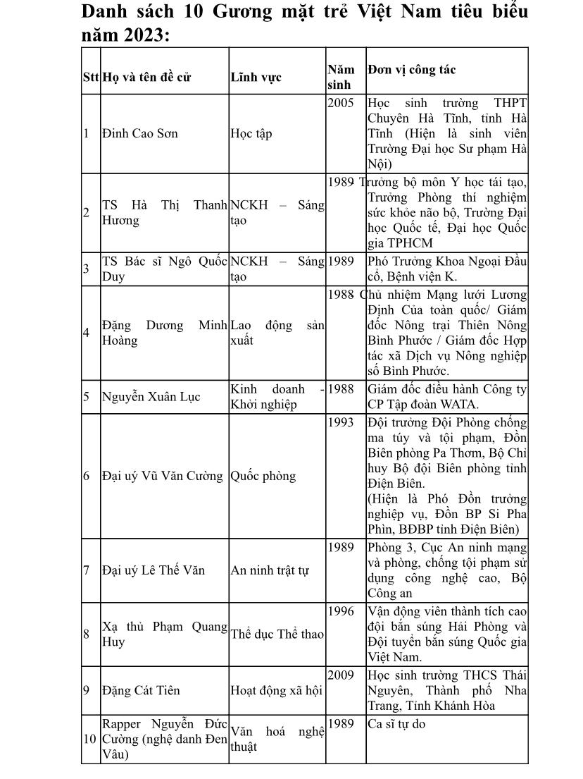 Các Gương mặt trẻ Việt Nam tiêu biểu và triển vọng năm 2023 là những tấm gương điển hình, với bảng thành tích ấn tượng, truyền cảm hứng mạnh mẽ, như: Nguyễn Đức Cường (ca sĩ Đen Vâu). Từ một một chàng trai là công nhân công ty vệ sinh môi trường ở Quảng Ninh, với tình yêu âm nhạc, Nguyễn Đức Cường đã trở thành Rapper hàng đầu Việt Nam và truyền đi cảm hứng sống và cống hiến cho cộng đồng với nghệ danh Đen Vâu;