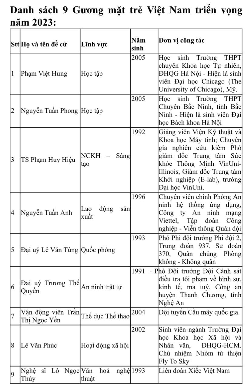9 Gương mặt trẻ Triển vọng năm 2023. Ảnh: BTC |