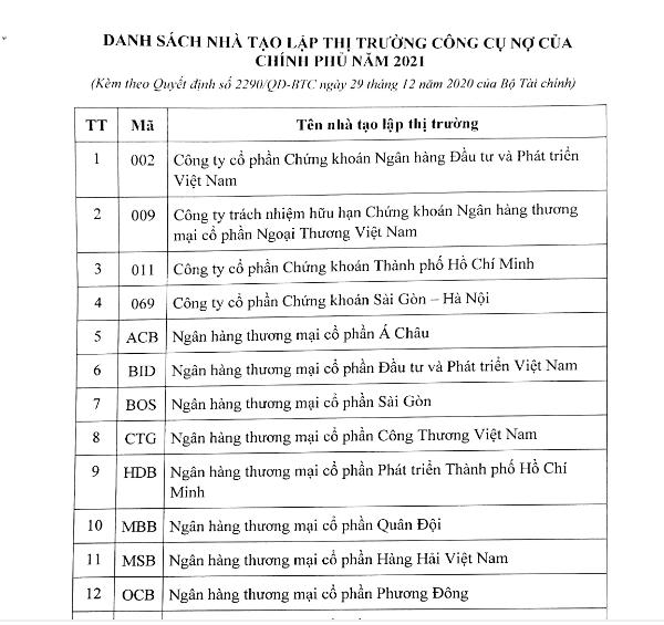 Ban hành kèm theo Quyết định số 2290/QĐ-BTC là danh sách 17 nhà tạo lập thị trường công cụ nợ của Chính phủ năm 2021 theo quy định tại Nghị định số 95/2018/NĐ-CP ngày 30/6/2018 của Chính phủ, bao gồm: Công ty CP Chứng khoán Ngân hàng Đầu tư và Phát triển Việt Nam, Công ty TNHH Chứng khoán Ngân hàng Thương mại (TM) Cổ phần (CP) Ngoại thương Việt Nam, Công ty CP Tp.HCM, Công ty CP Chứng khoán Sài Gòn – Hà Nội, Ngân hàng TM CP Á Châu, Ngân hàng TM CP Đầu tư và Phát triển Việt Nam, Ngân hàng TM CP Sài Gòn, Ngân hàng TM CP Công thương Việt Nam, Ngân hàng TM CP Phát triển TP.HCM, Ngân hàng TM CP Quân đội, Ngân hàng TM CP Hàng Hải Việt Nam, Ngân hàng TM CP Phương Đông, Ngân hàng TM CP Sài Gòn Thương Tín, Ngân hàng TM CP Kỹ Thương Việt Nam, Ngân hàng TM CP Tiên Phong, Công ty TNHH MTV Ngân hàng Nông nghiệp và Phát triển Nông thôn Việt Nam, Ngân hàng TM CP Việt Nam Thịnh Vượng.