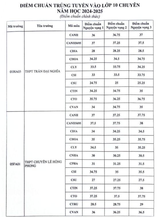 Điểm chuẩn lớp 10 chuyên cao nhất 37,75 thuộc về lớp chuyên Anh theo Đề án 5695 của Trường THPT chuyên Lê Hồng Phong (nguyện vọng 1; chuyên tiếng Anh (nguyện vọng 3) và lớp chuyên Toán (nguyện vọng 3).