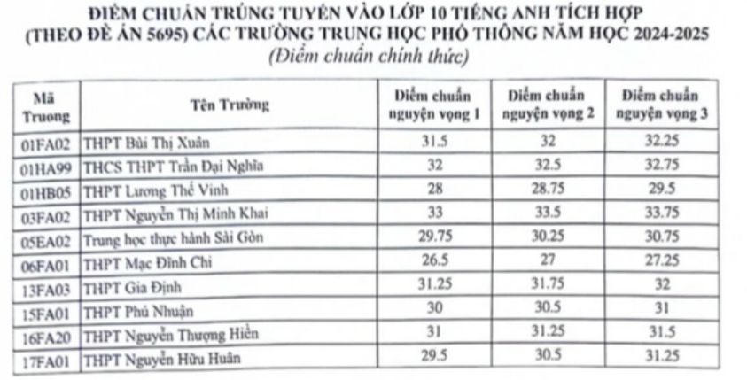 Tại Trường THPT chuyên Trần Đại Nghĩa, cao nhất là lớp chuyên Anh với 37,5 điểm ở nguyện vọng 3; tiếp đó là lớp chuyên Anh theo Đề án 5695 với 37,25 điểm...