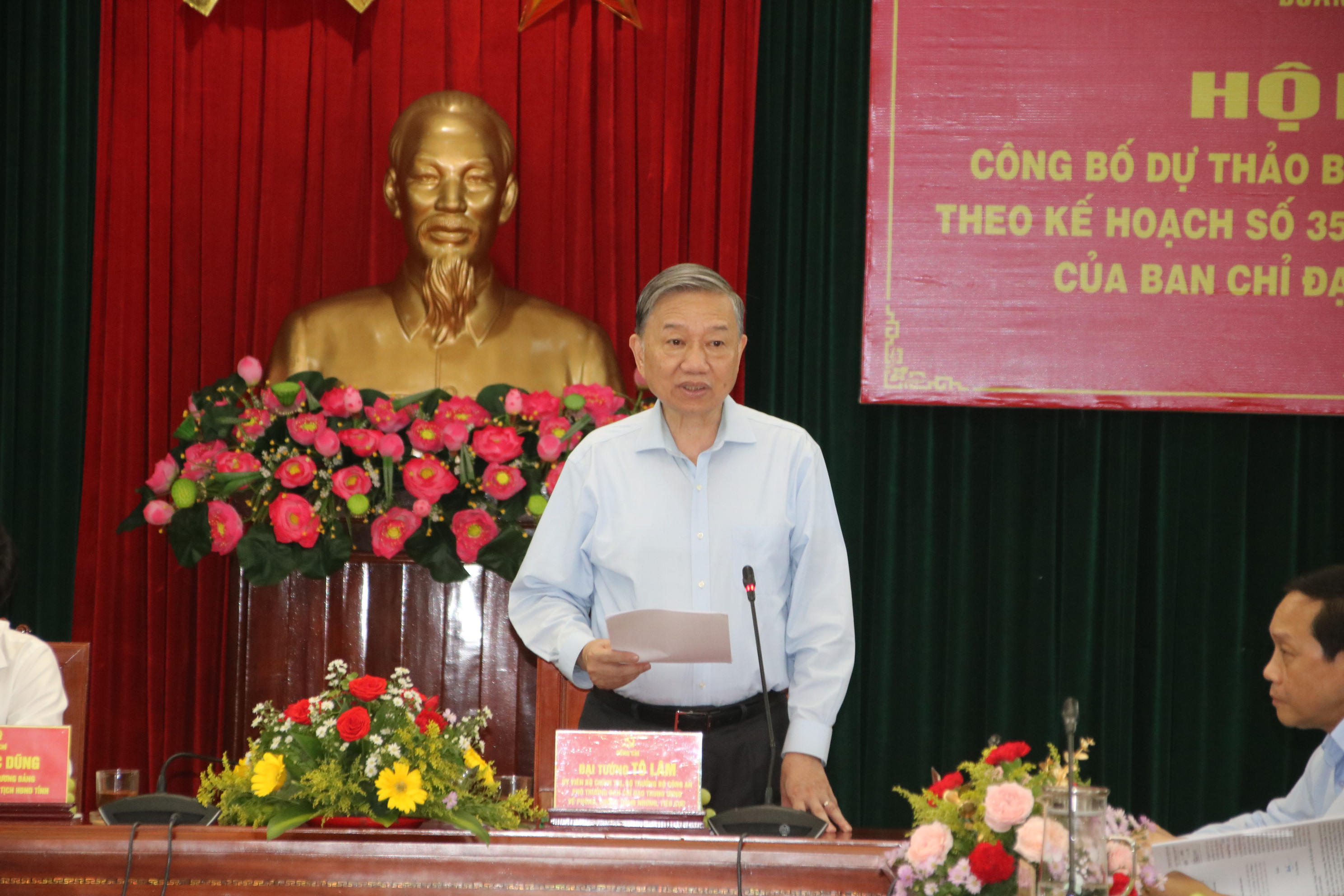 Phát biểu kết luận tại buổi làm việc, Đại tướng Tô Lâm đánh giá cao những kết quả mà tỉnh Bình Định đã đạt được trong việc thể chế hóa chủ trương, chính sách của Đảng về PCTNTC thành pháp luật của Nhà nước. Bộ trưởng Bộ Công an đề nghị Ban Thường vụ Tỉnh ủy Bình Định thường xuyên rà soát và kịp thời khắc phục các sơ hở về cơ chế, chính sách, văn bản quy phạm pháp luật về PCTNTC; tiếp tục tăng cường vai trò trách nhiệm, tính nêu gương trong vấn đề lãnh đạo, chỉ đạo, tổ chức thực hiện của người đứng đầu cơ quan, đơn vị đối với công tác thể chế hóa các chủ trương, chính sách PCTNTC.