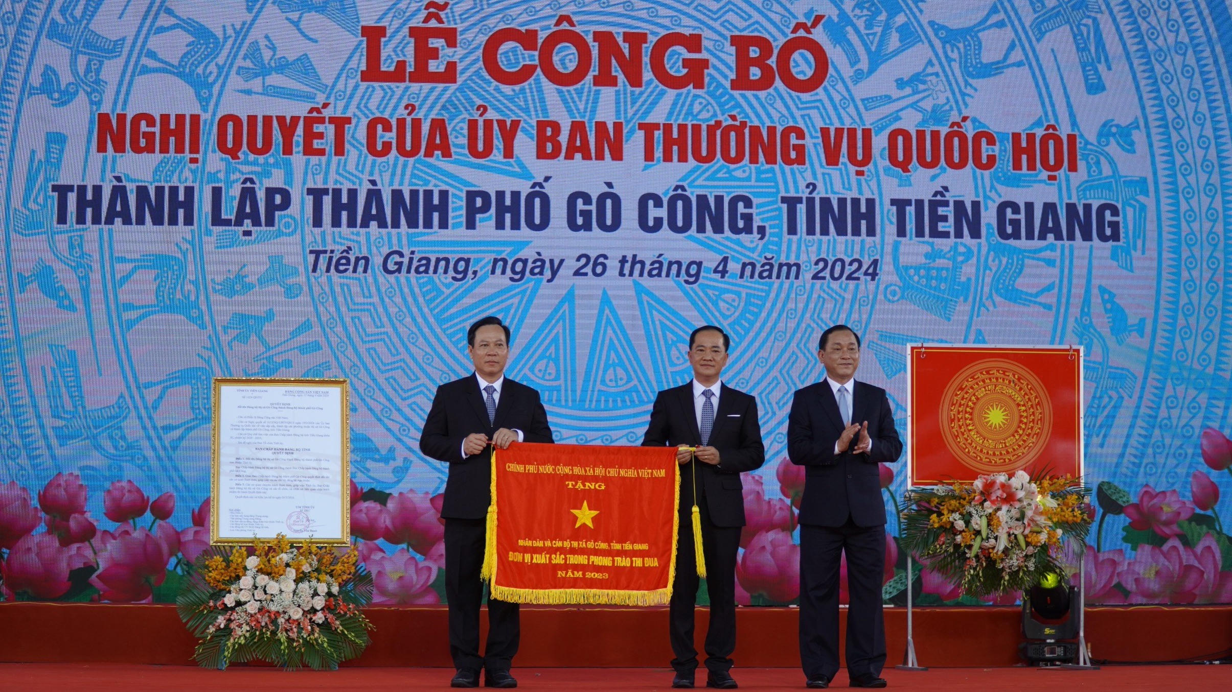 (PLVN) - Sáng 26/4, Tỉnh ủy, HĐND, UBND và Ủy ban Mặt trận Tổ quốc Việt Nam tỉnh Tiền Giang tổ chức lễ công bố Nghị quyết của Ủy ban Thường vụ Quốc hội thành lập thành phố (TP) Gò Công. Đây là thành phố thứ 2 thuộc tỉnh Tiền Giang.