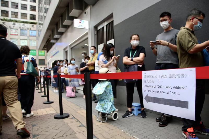 Người dân xếp hàng để nhận bản sao Chính sách thường niên 2021 tại Wan Chai, Hồng Kông, ngày 6/10/2021. Ảnh: China Daily |