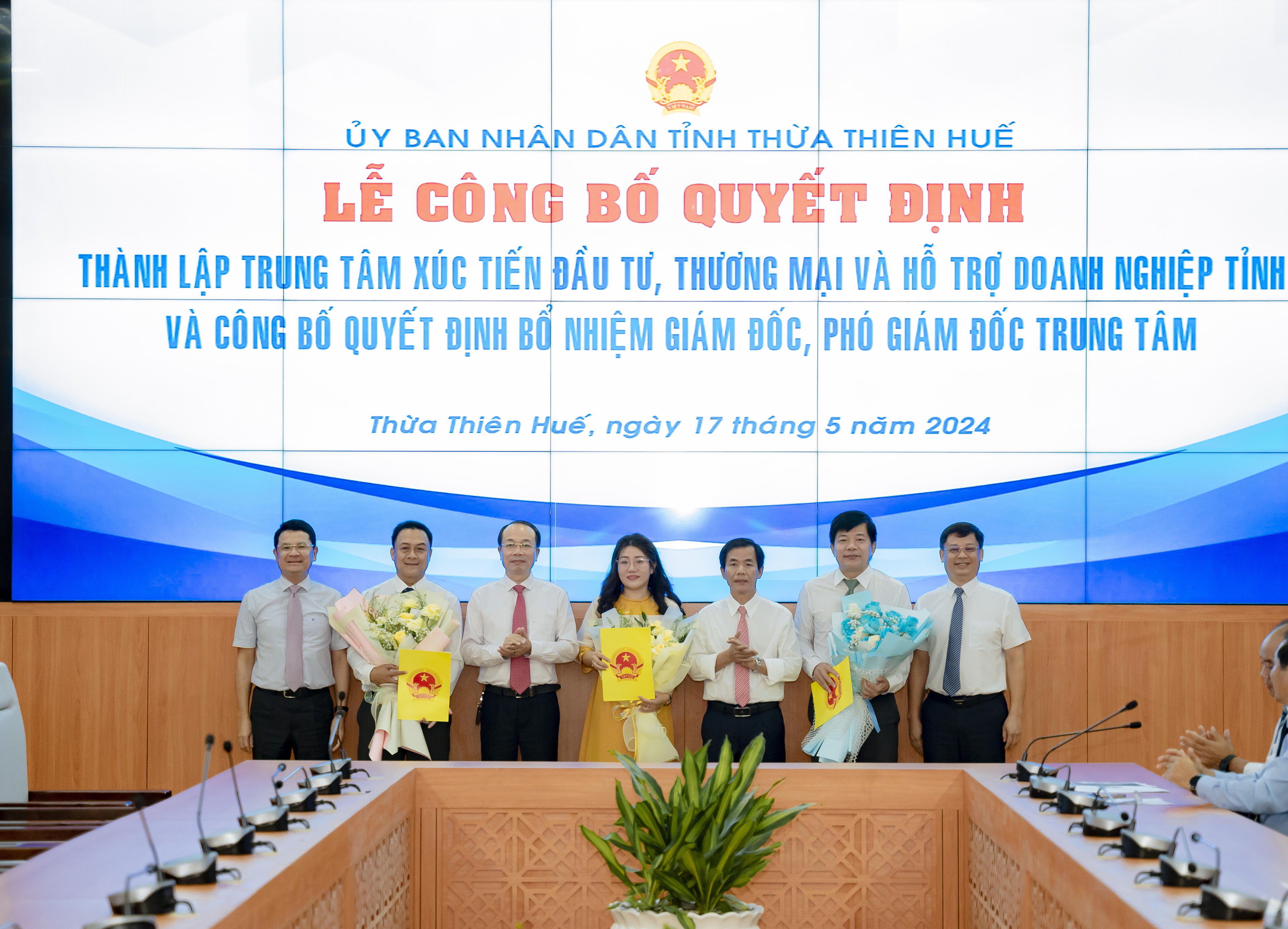 (PLVN) - Chiều nay (17/5), Ủy ban nhân dân tỉnh Thừa Thiên Huế công bố Quyết định số 336/QĐ-TTg của Thủ tướng Chính phủ về việc thành lập Trung tâm Xúc tiến Đầu tư, Thương mại và Hỗ trợ doanh nghiệp tỉnh (Trung tâm); đồng thời cũng công bố nhân sự lãnh đạo của Trung tâm.