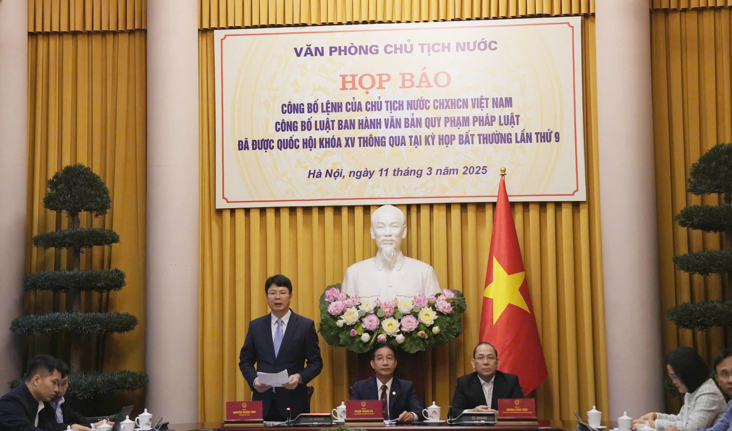 Tại họp báo, Phó Chủ nhiệm Văn phòng Chủ tịch nước Phạm Thanh Hà đã công bố Lệnh của Chủ tịch nước công bố Luật Ban hành văn bản quy phạm pháp luật vừa được Quốc hội khóa XV thông qua tại Kỳ họp bất thường lần thứ 9.