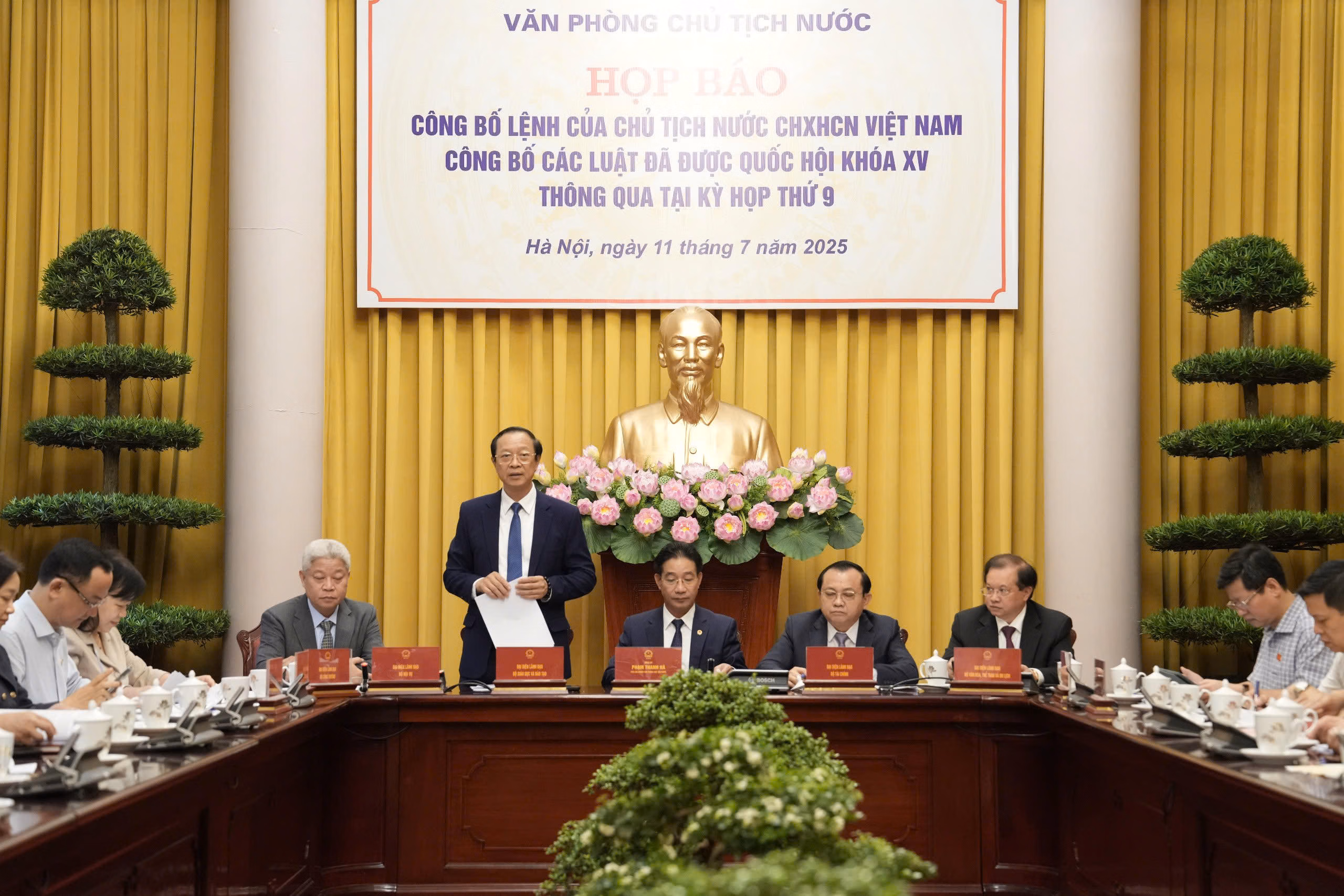 Sáng 11/7, Văn phòng Chủ tịch nước đã tổ chức họp báo công bố Lệnh của Chủ tịch nước công bố 9 Luật đã được Quốc hội khóa XV thông qua tại Kỳ họp thứ 9.