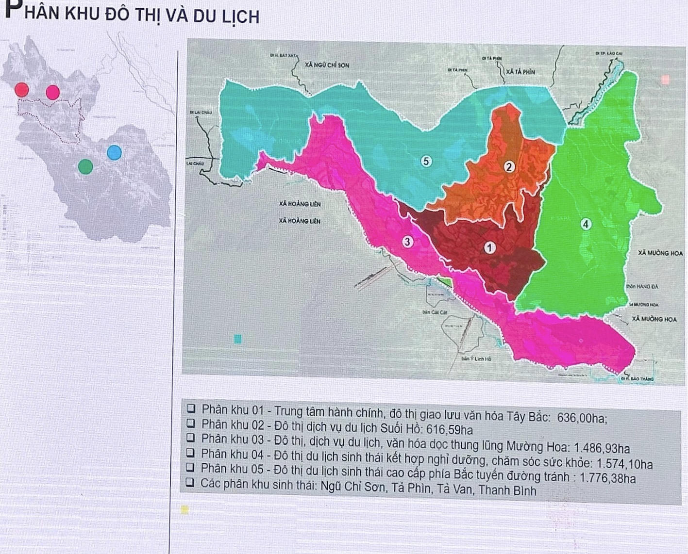 Định hướng quy hoạch 4 phân khu du lịch thuộc thị xã Sa Pa được kết nối với trung tâm của Khu du lịch Quốc gia Sa Pa, gồm các phân khu: Ngũ Chỉ Sơn, Tả Phìn, Tả Van và Thanh Bình.