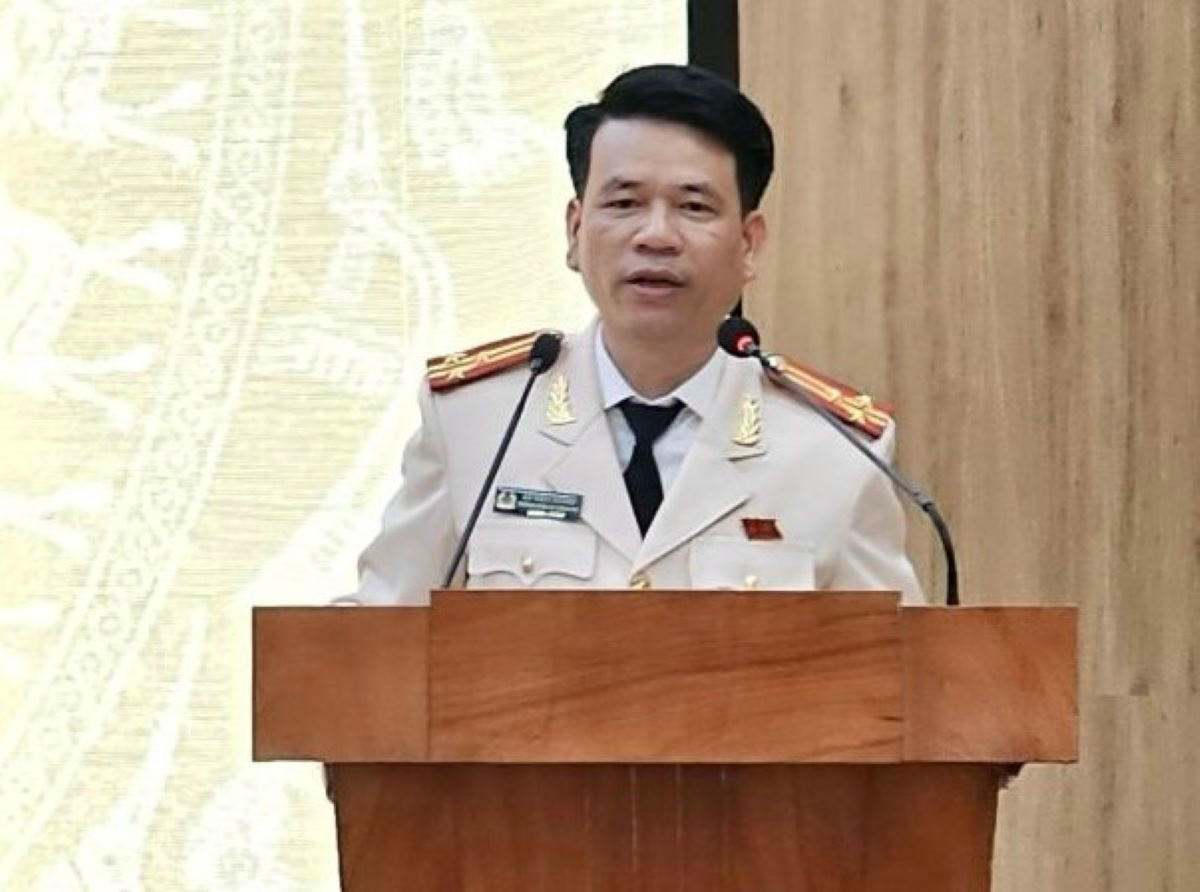 Tân Trưởng Công an TP Thanh Hóa Đỗ Ngọc Dương phát biểu nhận nhiệm vụ. Ảnh: Báo Công lý |