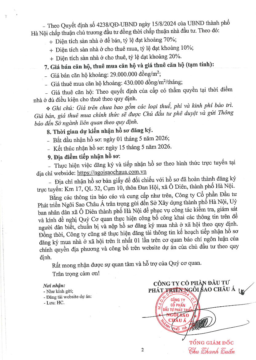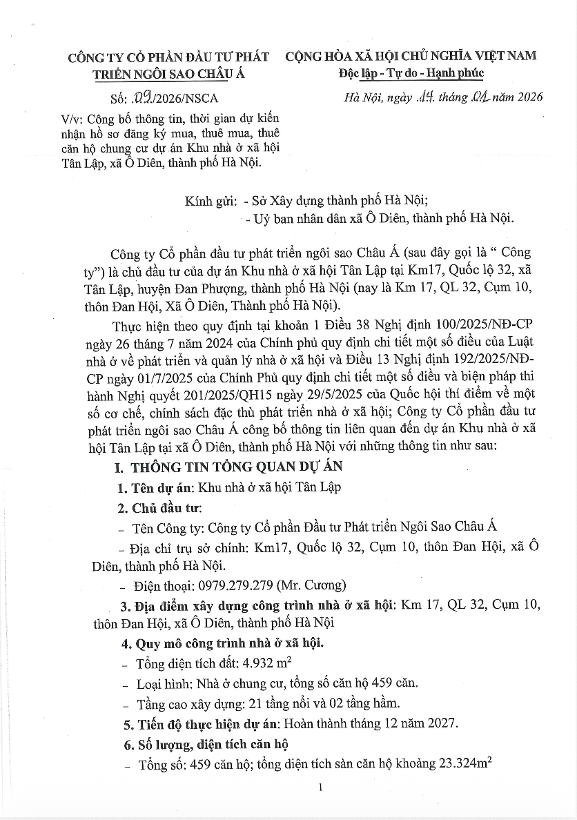 Dự án Khu nhà ở xã hội Tân Lập tại xã Ô Diên (Hà Nội) do Công ty Cổ phần Đầu tư Phát triển Ngôi Sao Châu Á làm chủ đầu tư vừa thông báo kế hoạch tiếp nhận hồ sơ vào tháng 5/2026 tới đây.