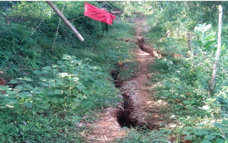 | Do ảnh hưởng của mưa, lũ, tại khu vực xóm Rài xuất hiện các vết nứt, sụt lún kéo dài khoảng từ 1 - 3m, sâu từ 2 -3m. Ảnh: Công an tỉnh Hòa Bình |