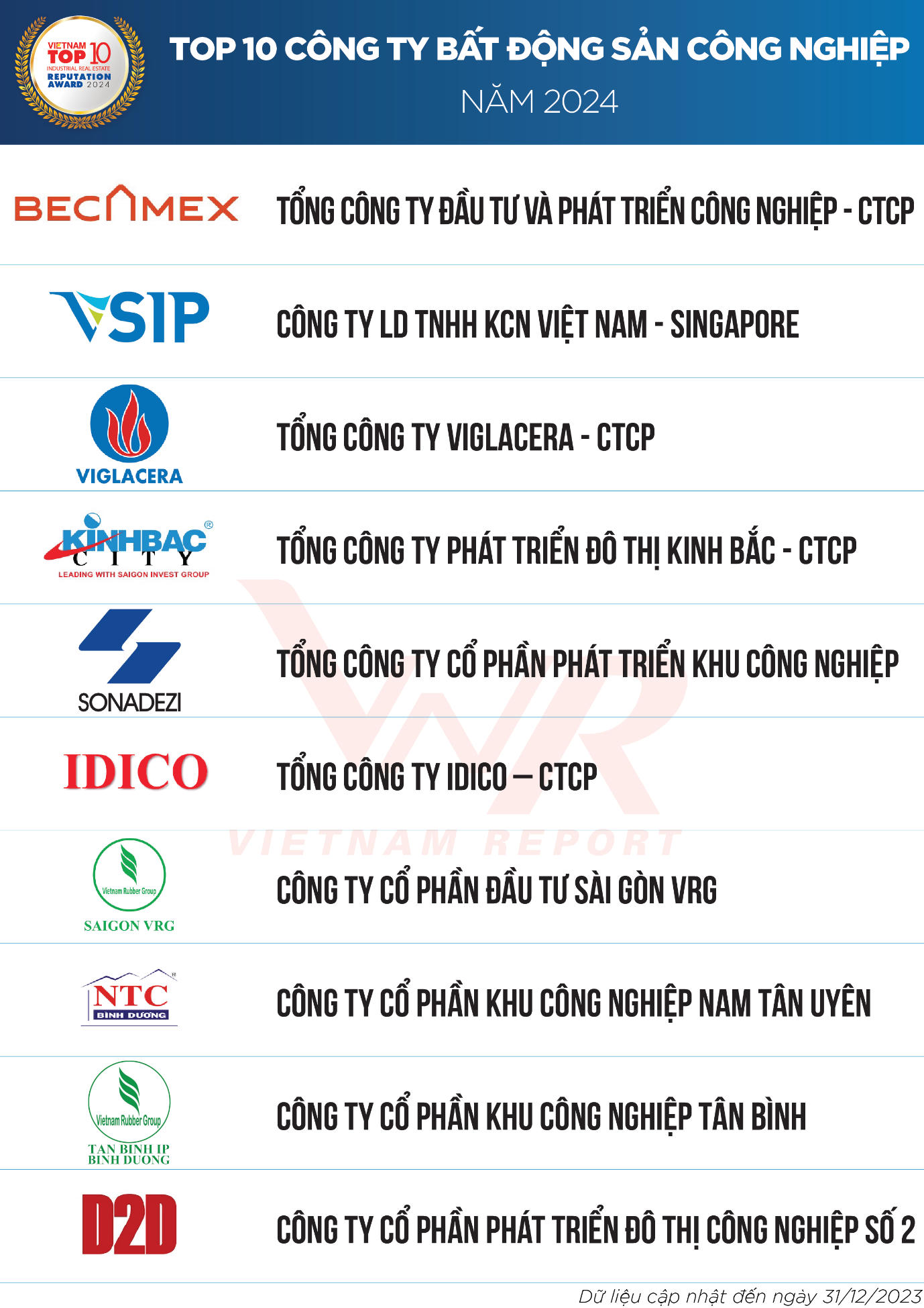 Riêng về BĐS công nghiệp, Top 10 Công ty gồm: Tổng Công ty Đầu tư và Phát triển Công nghiệp - CTCP; Công ty LD TNHH KCN Việt Nam - Singapore; Tổng Công ty Viglacera - CTCP; Tổng Công ty Phát triển Đô thị Kinh Bắc - CTCP; Tổng CTCT Phát triển Khu Công Nghiệp; Tổng Công ty Idico - CTCP; CTCT Đầu tư Sài Gòn VRG; CTCT Khu công nghiệp Nam Tân Uyên; CTCT Khu công nghiệp Tân Bình; CTCT Phát triển Đô thị Công nghiệp Số 2.