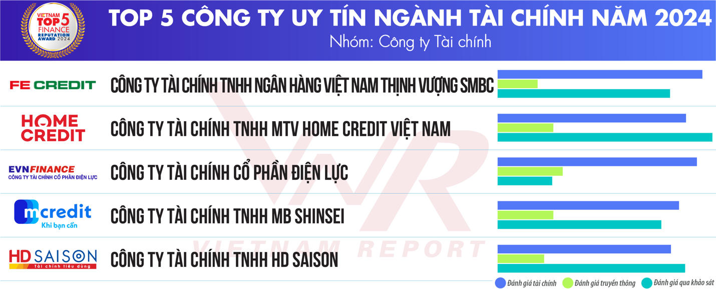 Đối với nhóm Công ty Tài chính, Top 5 Công ty uy tín ngành Tài chính năm 2024 gồm: Công ty Tài chính TNHH Ngân hàng Việt Nam Thịnh Vượng SMBC; Công ty Tài chính TNHH MTV Home Credit Việt Nam; Công ty Tài chính Cổ phần Điện Lực; Công ty Tài chính TNHH MB Shinsei; Công ty Tài chính TNHH HD Saison.