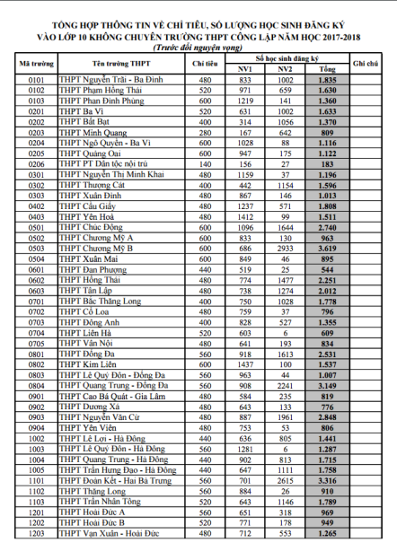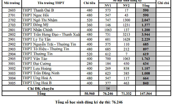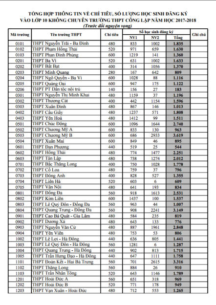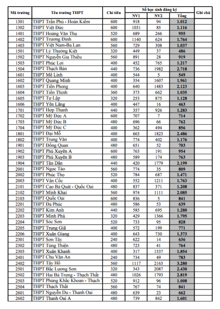 Theo Sở GD ĐT, toàn thành phố có hơn 50.000 chỉ tiêu tuyển sinh đầu cấp cho học sinh các trường. Tuy nhiên, số lượng học sinh đăng ký đã gần gấp 3 lần chỉ tiêu (147.500 hồ sơ). Trong đó, một số trường “top” có tỷ lệ chọi cao nhất như THPT Trần Hưng Đạo (Thanh Xuân) có 3.944 hồ sơ nhưng chỉ tuyển 480 chỉ tiêu (tỷ lệ chọi là 1/8.2); THPT Tây Hồ nhận được 3.280 hồ sơ so với chỉ tiêu là 560, (tỷ lệ chọi tương ứng là 1/5.8); THPT Chu Văn An nhận được 734 hồ sơ, so với chỉ tiêu là 240 học sinh, tỷ lệ chọi là 1/3. Tương tự, các trường khác như THPT Kim Liên, THPT Việt Đức... cũng có tỷ lệ chọi tương đối lớn.