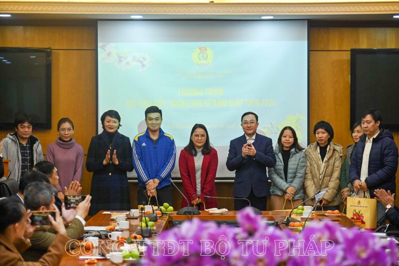 (PLVN) - Ngày 31/01, thực hiện chủ trương chung của Ban cán sự Đảng, Đảng ủy, Lãnh đạo Bộ, Công đoàn Viên chức Việt Nam về việc chăm lo, động viên, hỗ trợ công chức, viên chức, người lao động, đoàn viên công đoàn khó khăn và gia đình chính sách của Bộ Tư pháp nhân dịp Tết Nguyên đán Giáp Thìn 2024, Công đoàn Bộ Tư pháp đã tổ chức Chương trình “Tết sum vầy, xuân chia sẻ năm Giáp Thìn 2024”.