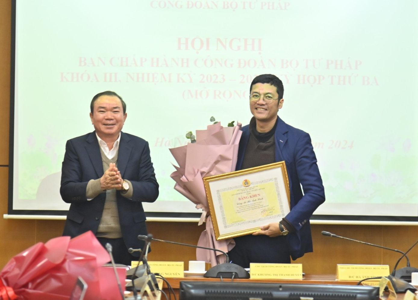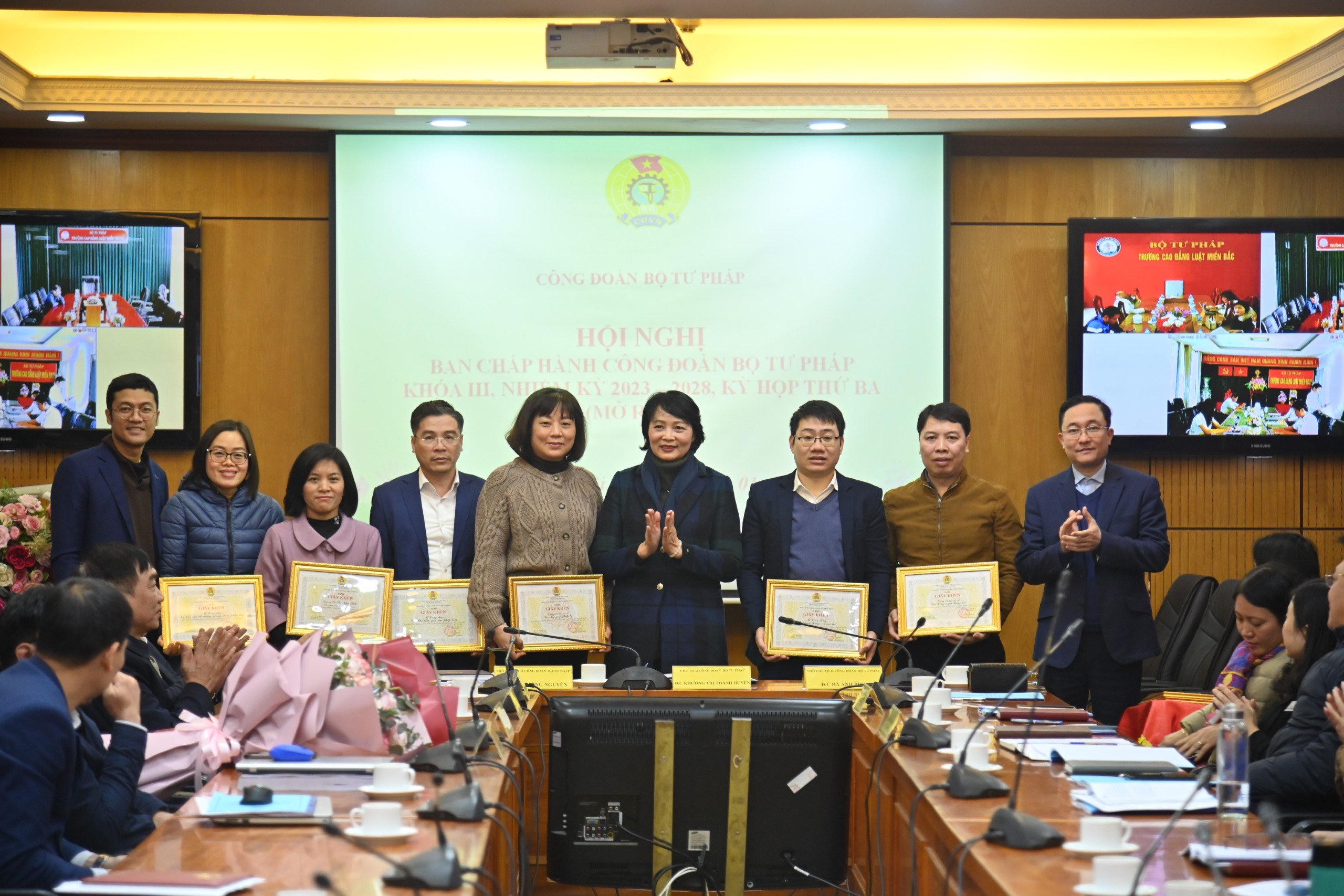 Nhân Hội nghị lần này, Công đoàn Bộ đã tặng kỷ niệm chương “Vì sự nghiệp xây dựng tổ chức Công đoàn”; tặng Cờ thi đua của Ban Chấp hành Công đoàn viên chức Việt Nam; tặng giải thưởng “Gương mặt của năm – 2023”; tặng bằng khen của Ban Chấp hành Công đoàn viên chức Việt Nam; tặng bằng khen chuyên đề “Giỏi việc nước, đảm việc nhà” của Ban Chấp hành Công đoàn viên chức Việt Nam; tặng Giấy khen của Ban Chấp hành Công đoàn Bộ Tư pháp; tặng giấy khen chuyên đề “Giỏi việc nước, đảm việc nhà” của Ban Chấp hành Công đoàn Bộ Tư pháp…/.