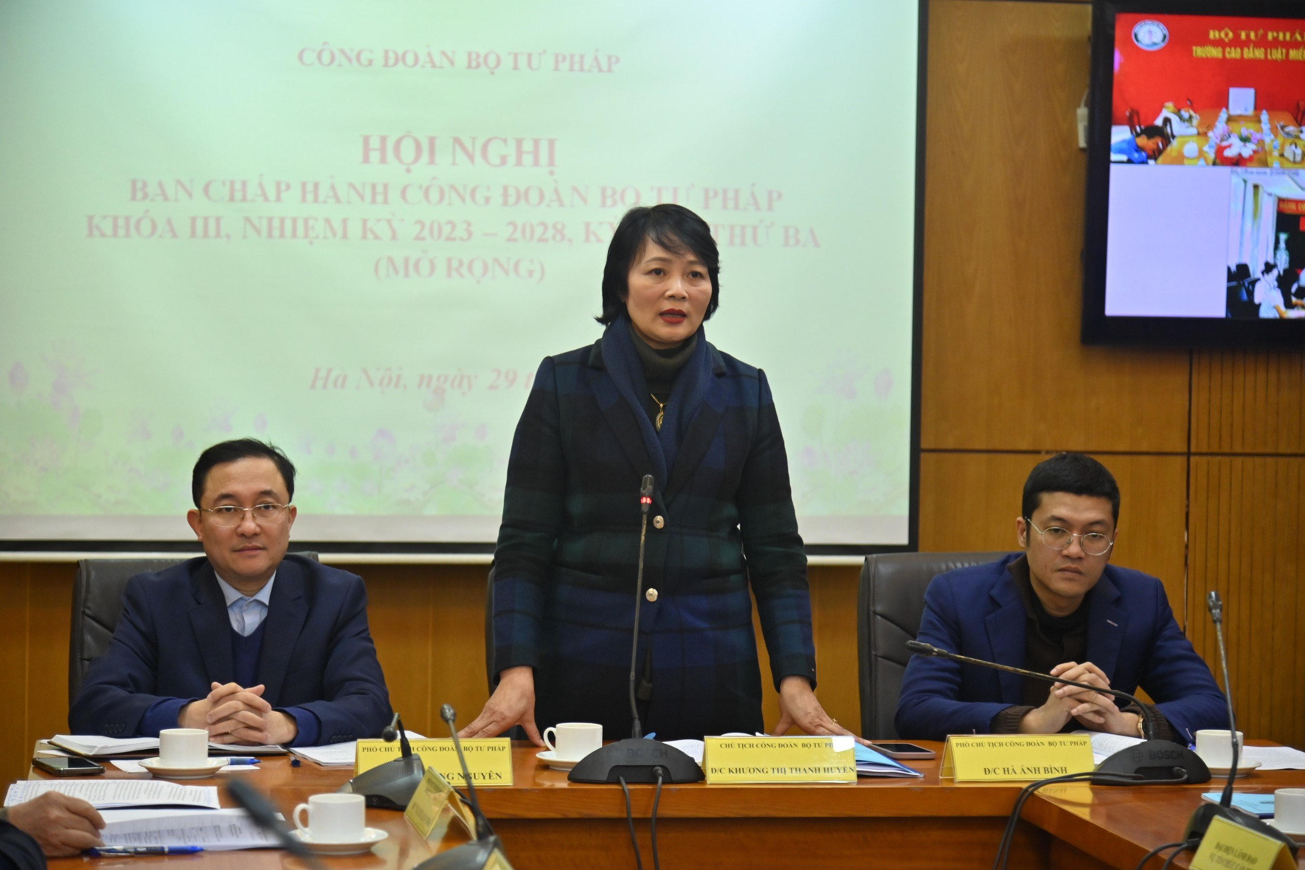 Đồng chủ trì Hội nghị là Chủ tịch Công đoàn Bộ Tư pháp Khương Thị Thanh Huyền, Phó Chủ tịch Công đoàn Bộ, Phó Cục trưởng Cục Phổ biến giáo dục pháp luật Phan Hồng Nguyên và Phó Chủ tịch Công đoàn, Phó Tổng Biên tập Báo Pháp luật Việt Nam Hà Ánh Bình. Phó Bí thư thường trực Đảng ủy Bộ Tư pháp dự và phát biểu chỉ đạo tại Hội nghị.
