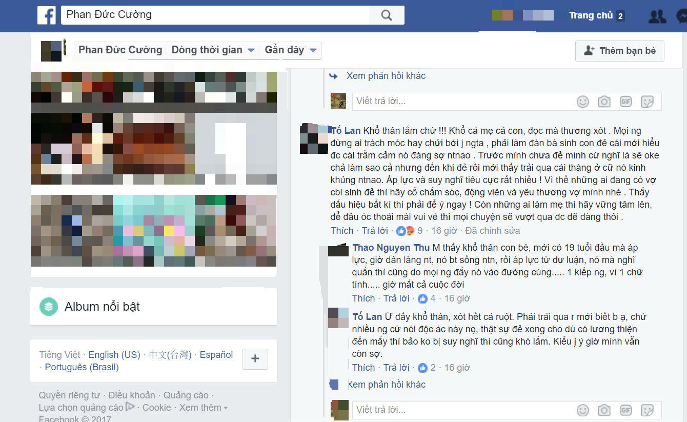 Cũng giống bạn Bùi Thị Liên, facebook Tố Lan đưa ra lời chia sẻ: “Khổ thân lắm chứ !!! Khổ cả mẹ cả con, đọc mà thương xót . Mọi người đừng ai trách móc hay chửi bới gì người ta, phải làm đàn bà sinh con đẻ cái mới hiểu được cái trầm cảm nó đáng sợ như thế nào. Trước mình chưa sinh mình cứ nghĩ là sẽ oke chả làm sao cả nhưng đến khi sinh rồi mới thấy trải qua cái tháng ở cữ nó kinh khủng như thế nào. Áp lực và suy nghĩ tiêu cực rất nhiều ! Vì thế những ai đang có vợ chuẩn bị sinh đẻ thì hãy cố chăm sóc, động viên và yêu thương vợ mình nhé . Thấy dấu hiệu bất kì thì phải để ý ngay ! Còn những ai làm mẹ thì hãy vững tâm lên, để đầu óc thoải mái vui vẻ thì mọi chuyện sẽ vượt qua được dễ dàng thôi”.