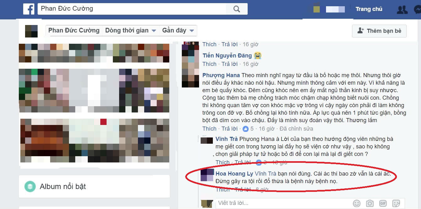 “Cái ác thì bao giờ vẫn là cái ác. Đừng gây ra tội rồi đổ thừa là bệnh này bệnh nọ” – bạn Hoa Hoang Ly bình luận trên dòng thời gian của facebook Phan Đức Cường.