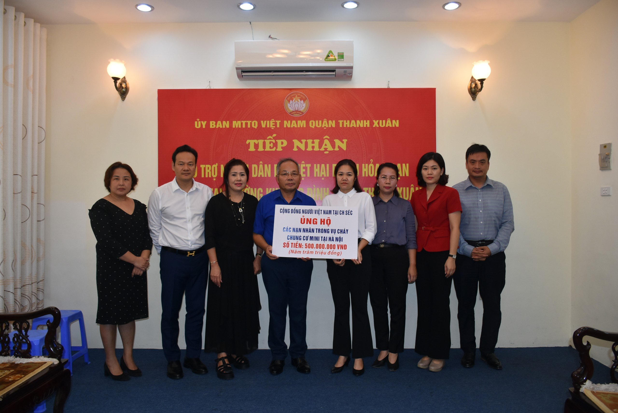 Cộng đồng người Việt Nam tại Séc đã trao số tiền 500 triệu đồng thông qua Mặt trận Tổ quốc quận Thanh Xuân hỗ trợ cho các hộ dân trong vụ cháy chung cư mini tại phường Khương Đình. |