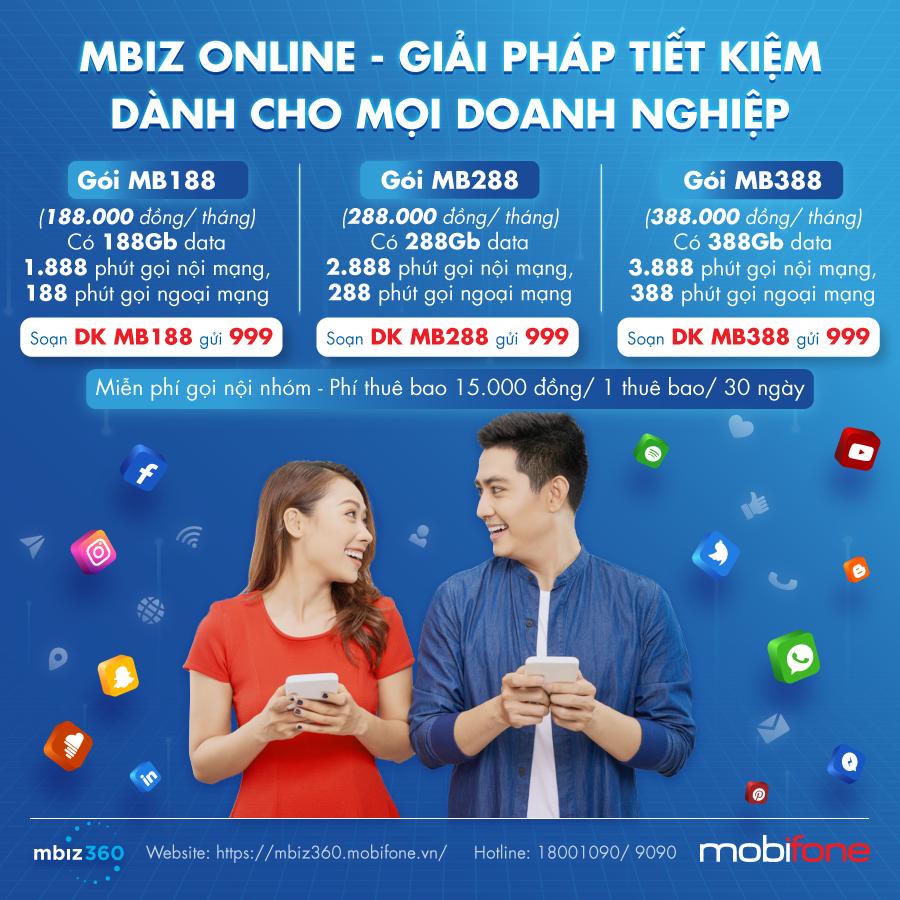mBiz được thiết kế với 3 lựa chọn gói cước ưu đãi phù hợp cho các nhu cầu đa dạng của DN. Trong đó, gói MB188 chỉ với 188.000 đồng/30 ngày gồm 188 Gb data, 1.888 phút gọi nội mạng, 188 phút gọi ngoại mạng. Gói MB288 với 288.000 đồng/30 ngày có ngay 288 Gb data, 2.888 phút gọi nội mạng, 288 phút gọi ngoại mạng; Hoặc với nhu cầu sử dụng internet và thoại cao hơn, các doanh nghiệp có thể lựa chọn gói MB388 với mức phí là 388.000 đồng/30 ngày có 388Gb data, 3.888 phút gọi nội mạng, 388 phút gọi ngoại mạng.