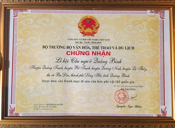 Tối 29/4, tại Quảng trường biển Bảo Ninh (TP Đồng Hới), Bộ Văn hoá – Thể thao và Du lịch đã trao Bằng chứng nhận Lễ hội Cầu ngư cho các huyện Quảng Trạch, huyện Bố Trạch, huyện Quảng Ninh, huyện Lệ Thuỷ, thị xã Ba Đồn, TP Đồng Hới (Quảng Bình) là di sản văn hoá phi vật thể Quốc gia theo Quyết định số 4069/QB-BVHTTDL ngày 30/10/2018.