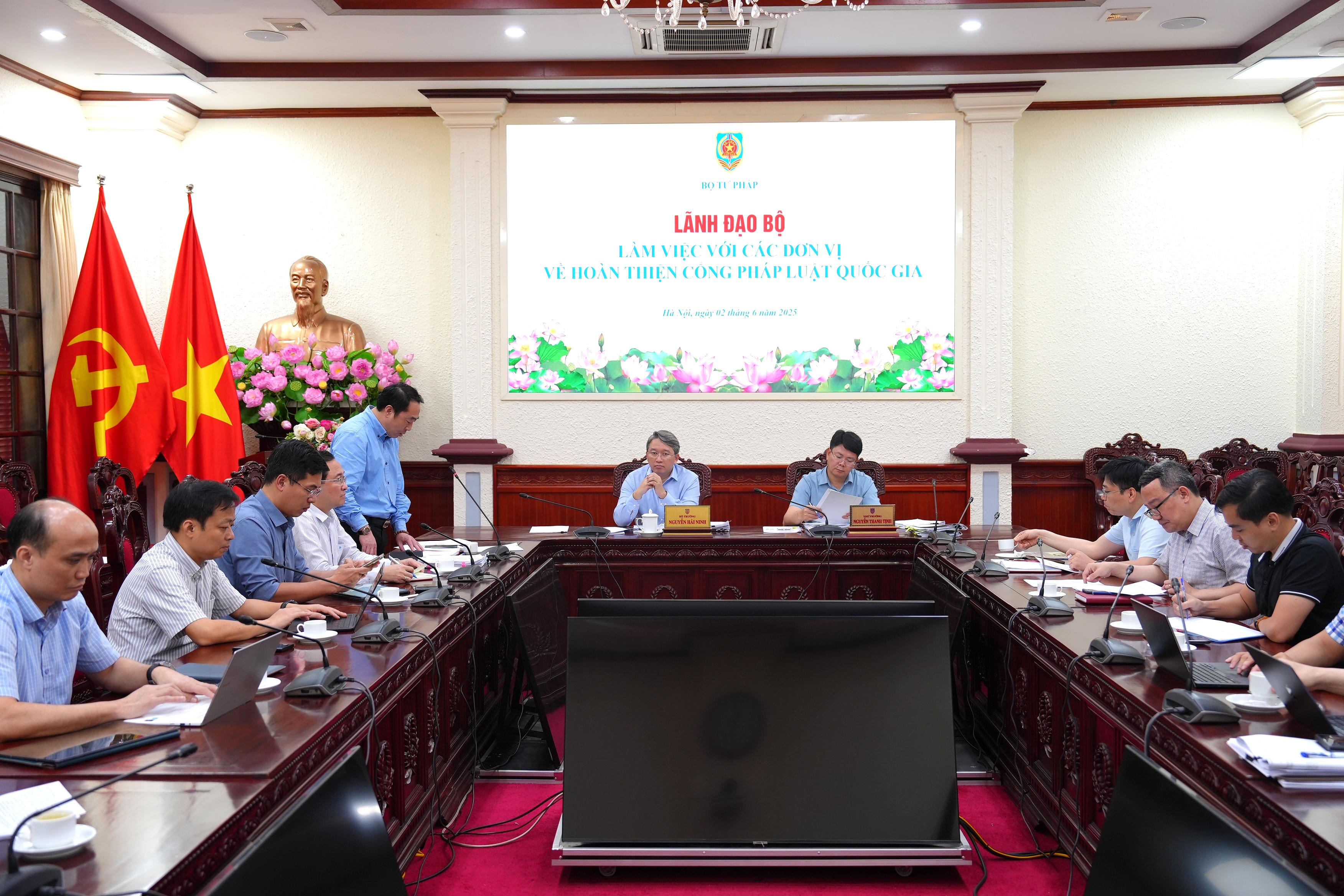 (PLVN) - Chiều 2/6, tại trụ sở Bộ Tư pháp, Bộ trưởng Nguyễn Hải Ninh đã chủ trì buổi làm việc với các đơn vị liên quan về tiến độ hoàn thiện Cổng Pháp luật Quốc gia. Tham dự cuộc họp có Thứ trưởng Nguyễn Thanh Tịnh và lãnh đạo các đơn vị liên quan.